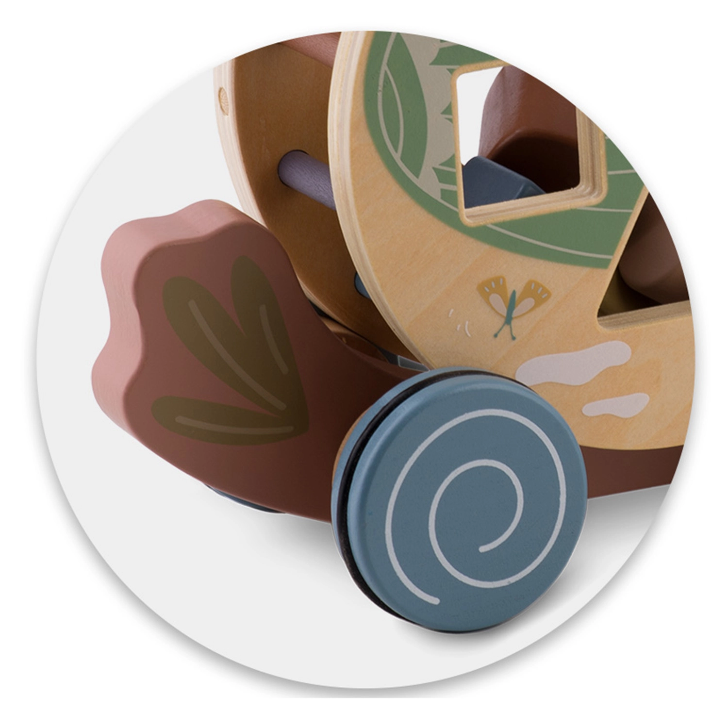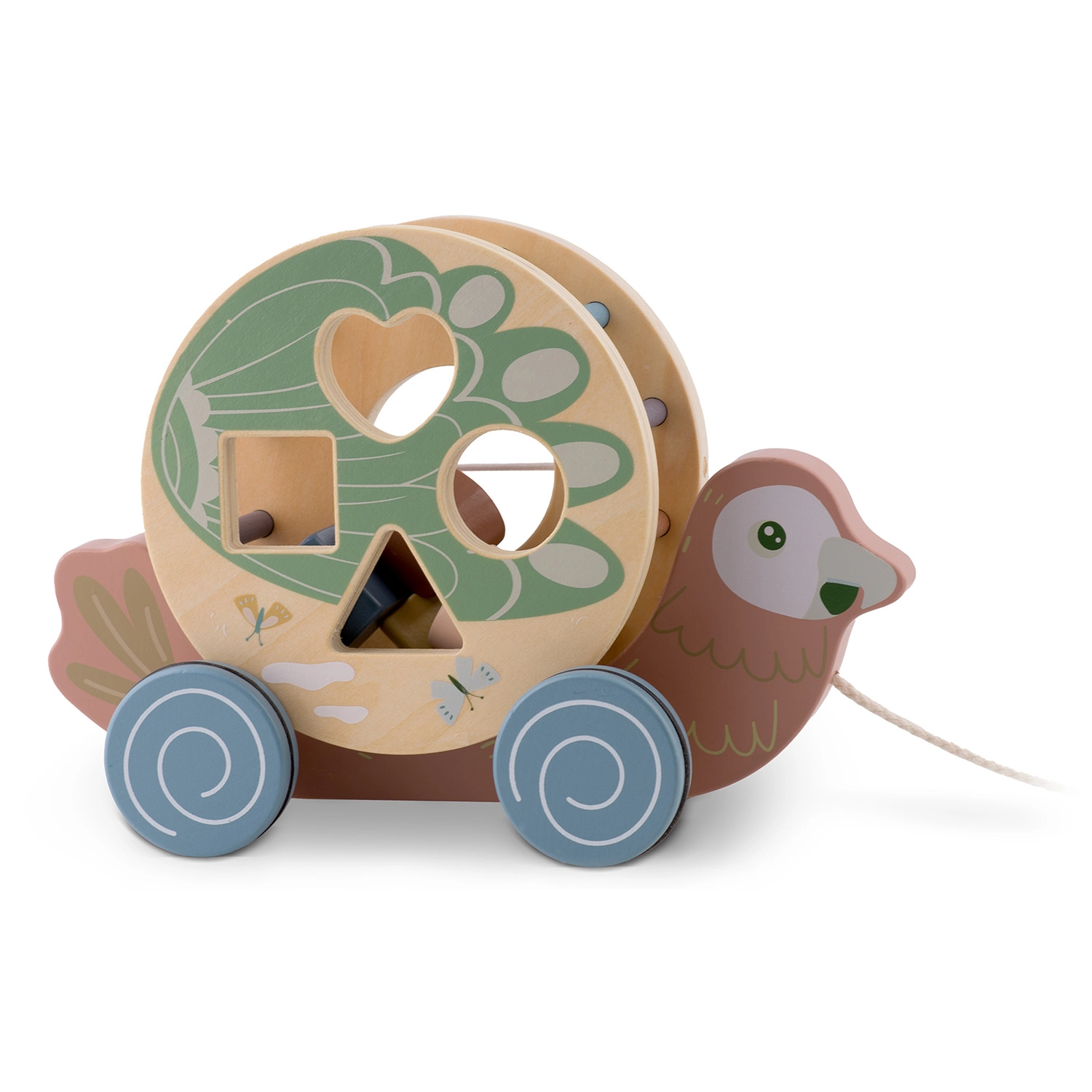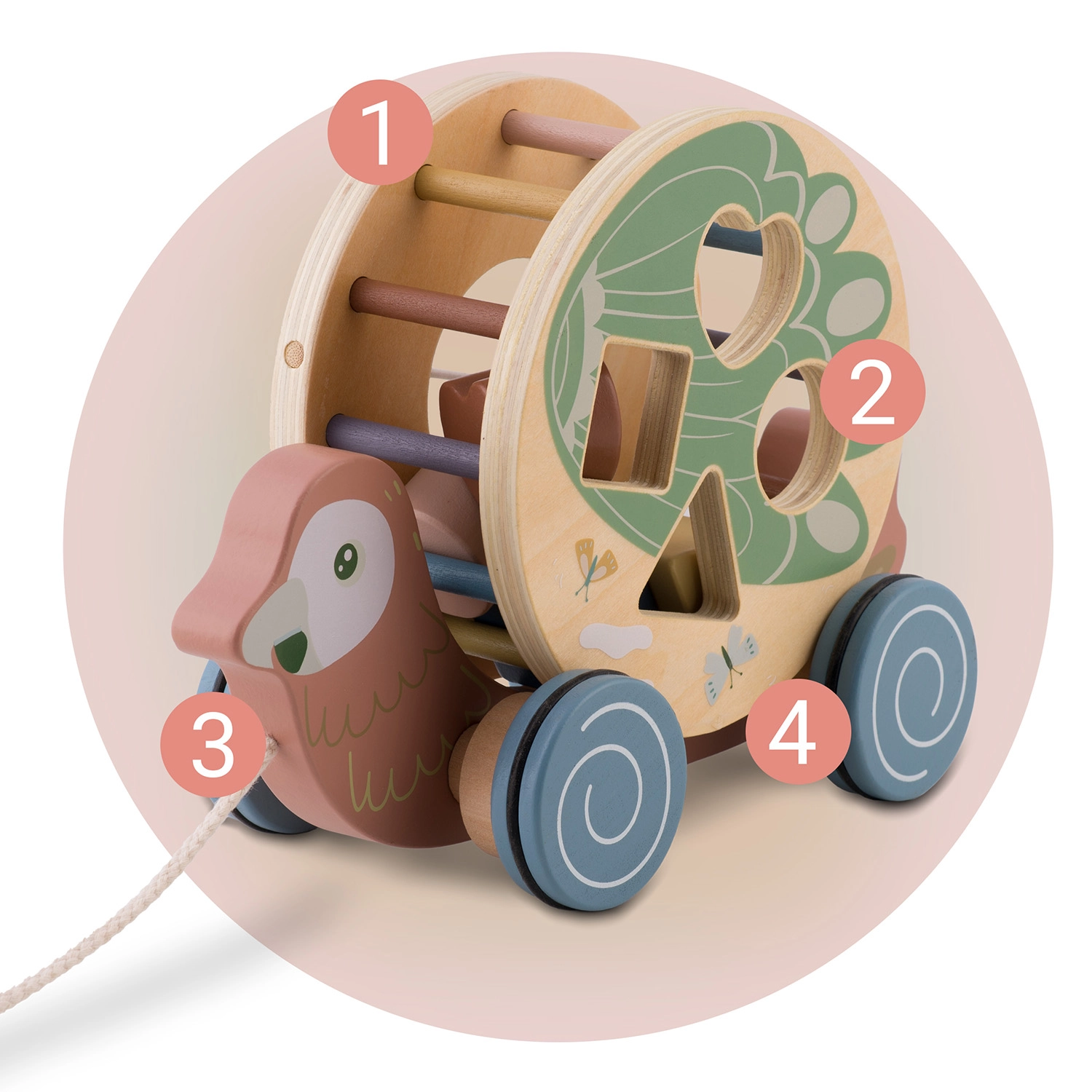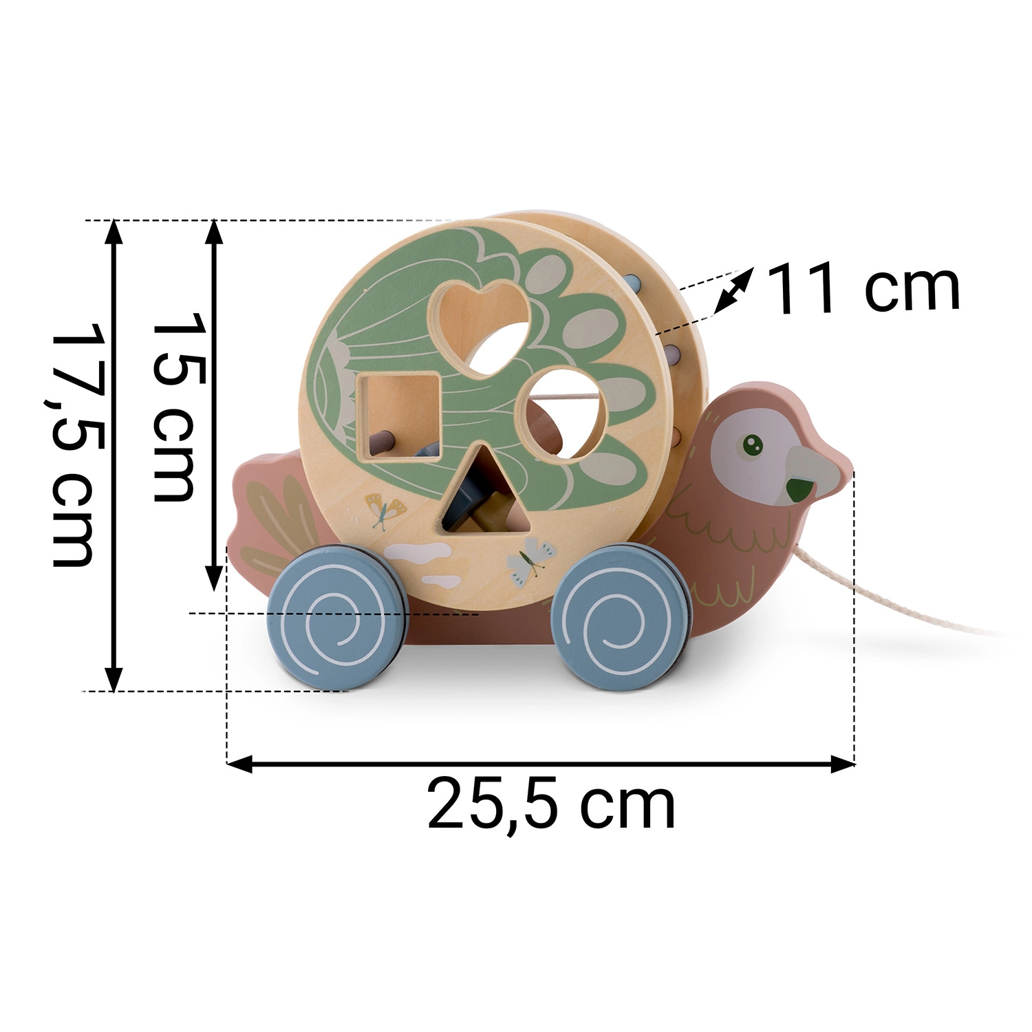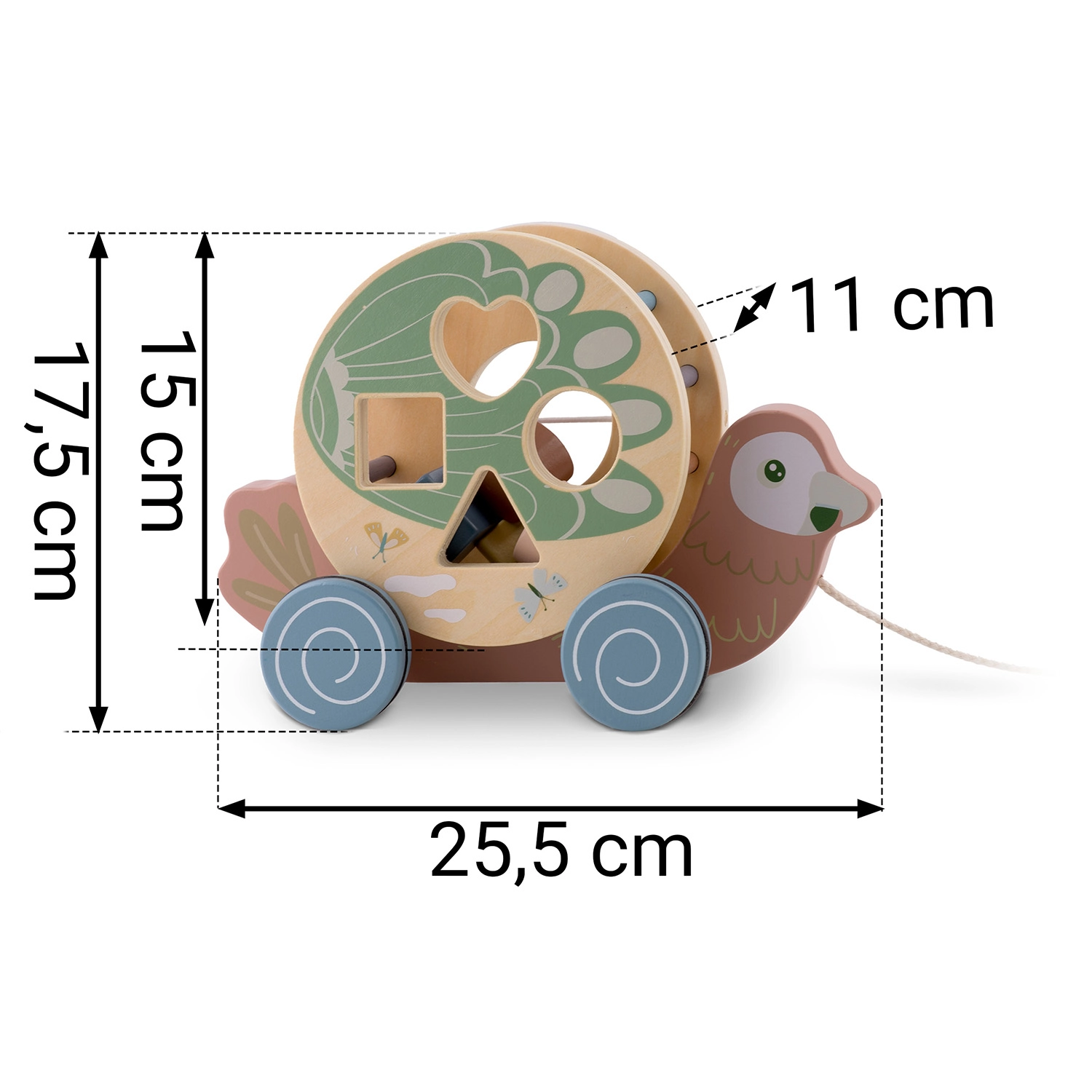 Leseni papagaj znamke NUKIDO združuje dve priljubljeni dejavnosti v eni igrački: vlečno žival na kolescih in vrtečo se sortirko oblik. Med gibanjem se boben z izrezi (srce, kvadrat, krog, trikotnik) vrti, kar otroke spodbuja k raziskovanju odnosa vzrok–posledica in k veslemu gibanju. Pastelne barve, gladki robovi in trdna lesena konstrukcija zagotavljajo varno in dolgotrajno zabavo.