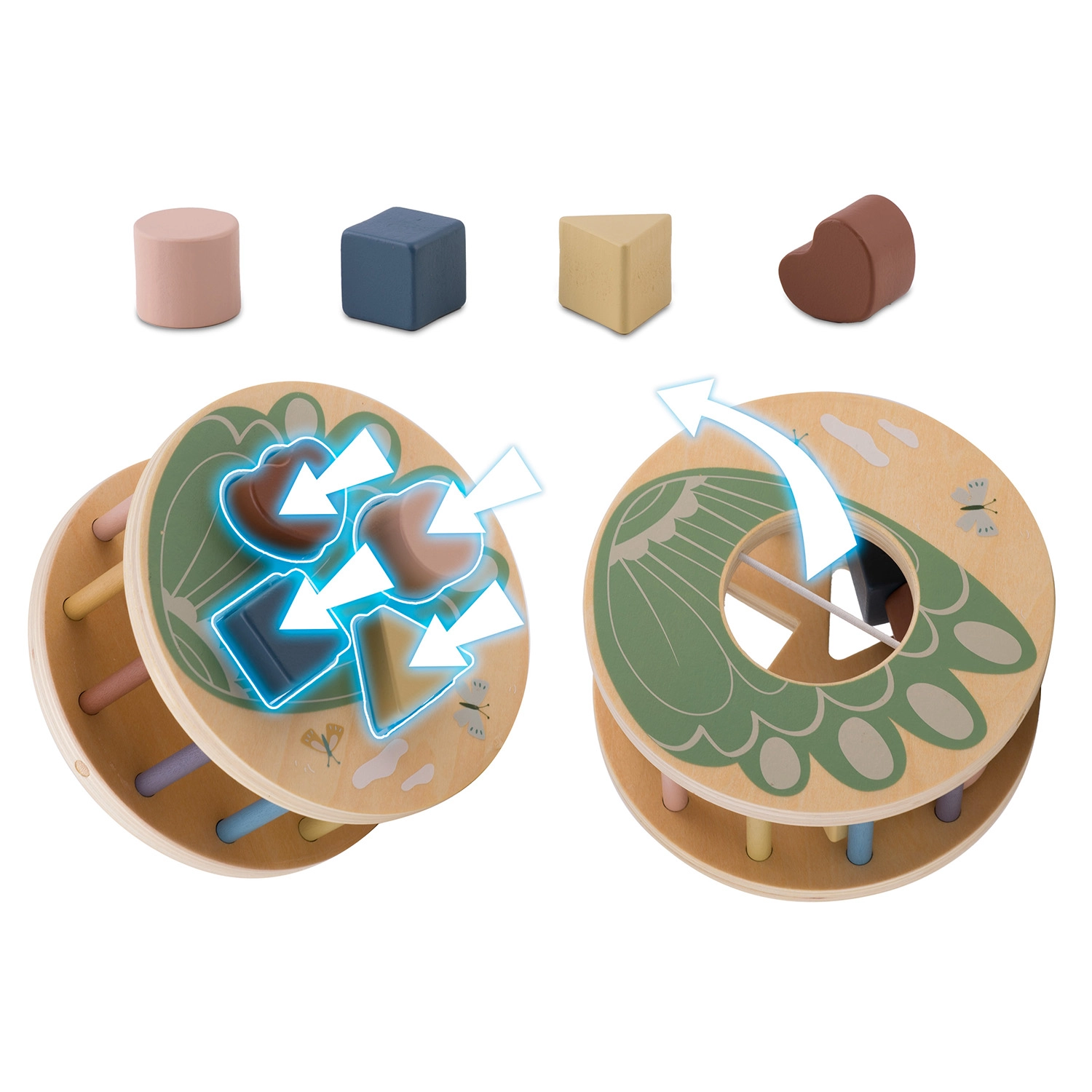 Boben z izrezi se med vlečenjem vrti, kar otroke motivira k vstavljanju pravilnih oblik ter jih uči odnosa vzrok–posledica in razločevanja barv ter oblik.