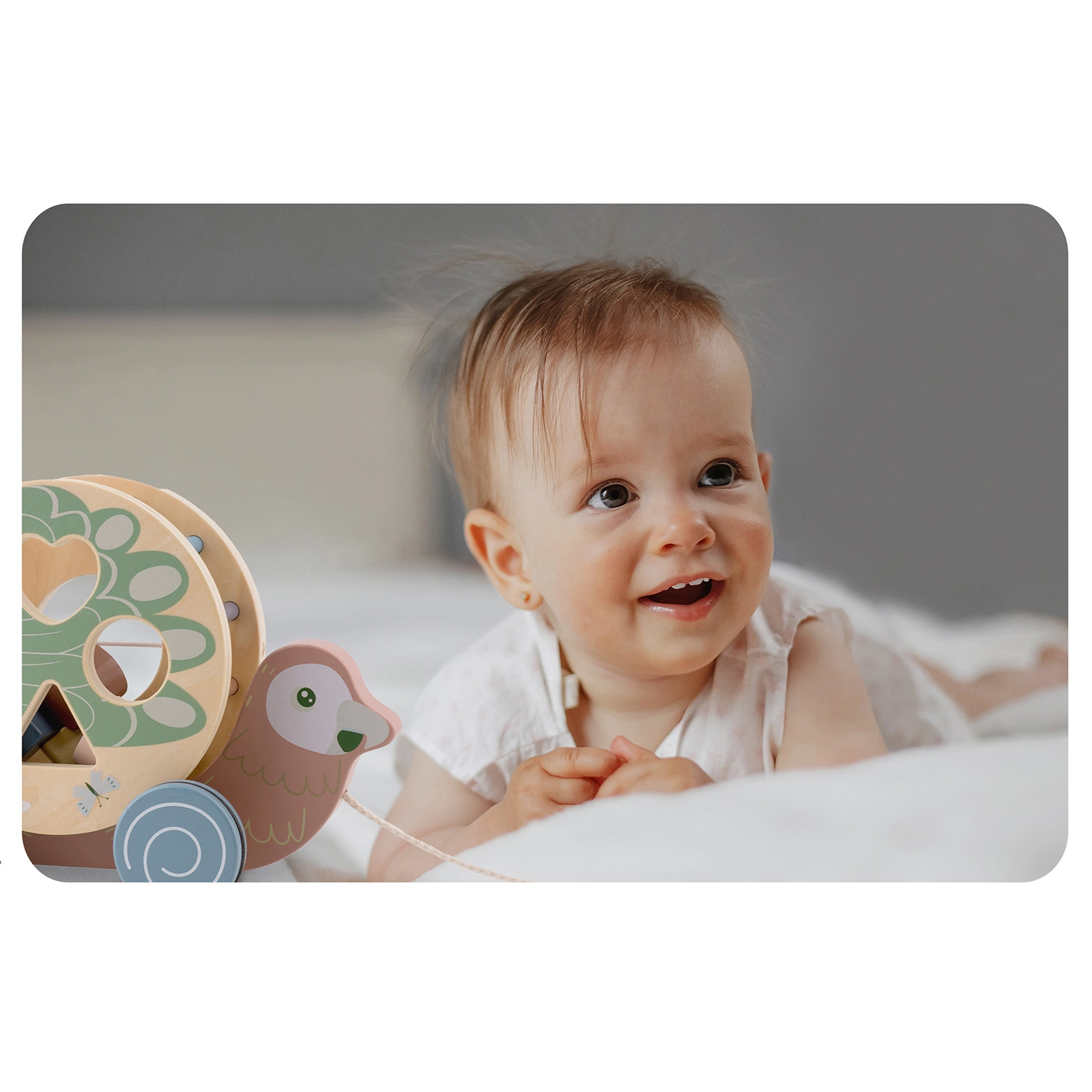 Igrača je multifunkcionalna: boben–sortirko lahko s papagaja snemete in uporabljate samostojno za mirno razvrščanje in učenje oblik, medtem ko je celotna žival odlična za aktivno igro in prve korake z vrvico. Navdih Montessori podpira čutno zaznavanje, načrtovanje gibov in naravno samostojnost pri igri.
