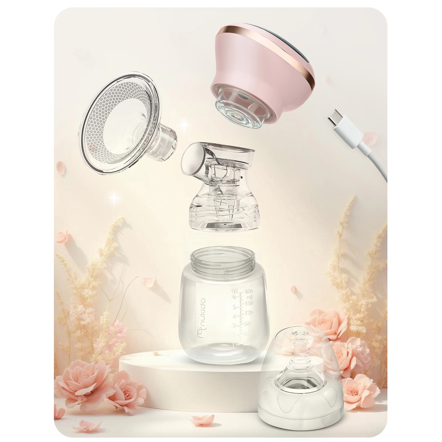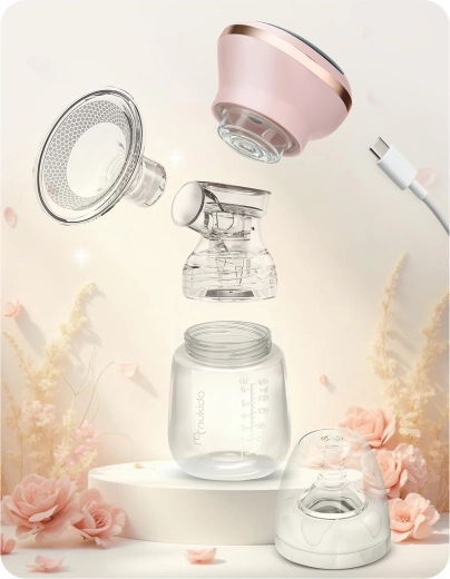 Lahka in kompaktna zasnova z vgrajeno Li-baterijo nudi do 6 ur delovanja z enim polnjenjem, polnjenje prek USB‑C pa olajša dopolnjevanje energije doma, v službi ali na poti. Tiho delovanje zagotavlja diskretno uporabo brez motenja spanca dojenčka.