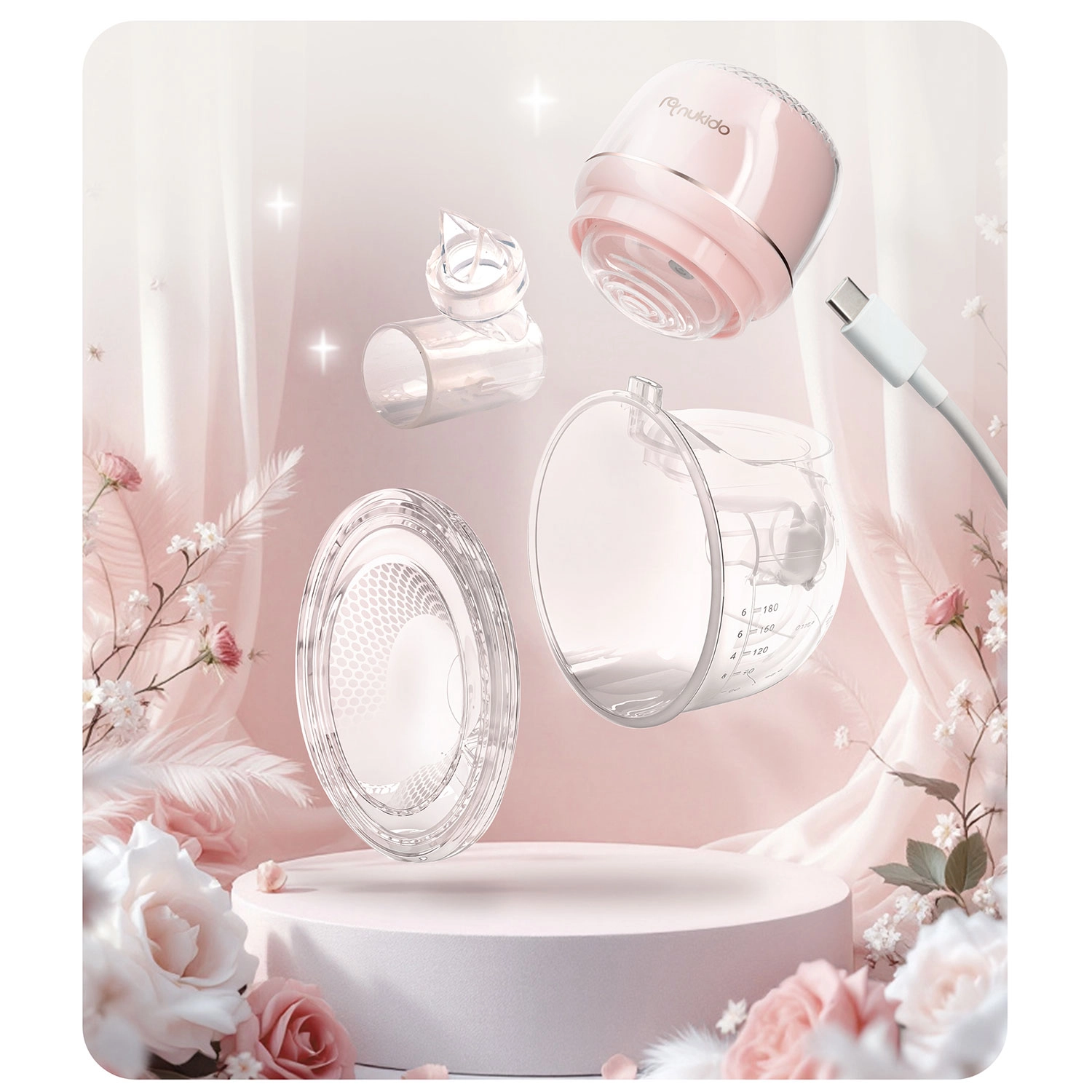 Mehka silikonska masažna blazinica z anatomsko obliko se nežno prilagodi in z mehko masažo spodbuja spuščanje mleka. Brezžična zasnova z vgrajeno litijevo baterijo zagotavlja svobodo gibanja do 3 ure, polnjenje pa poteka udobno prek USB‑C. Dele (razen elektronskega panela) je mogoče pomivati v pomivalnem stroju, materiali imajo antibakterijske lastnosti in ne vsebujejo BPA.