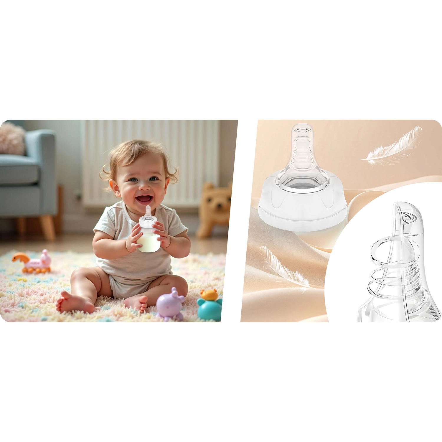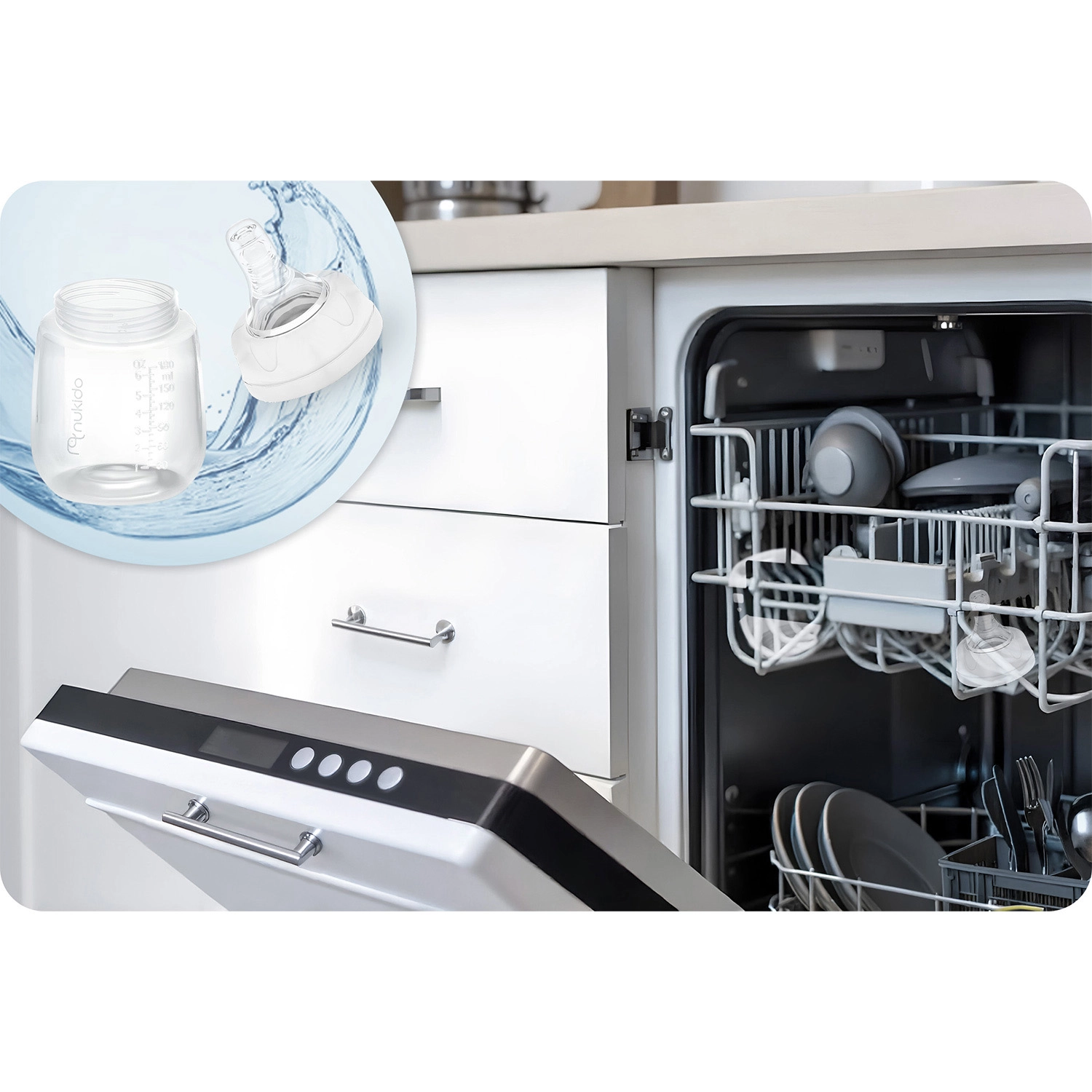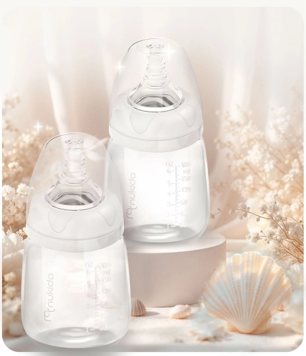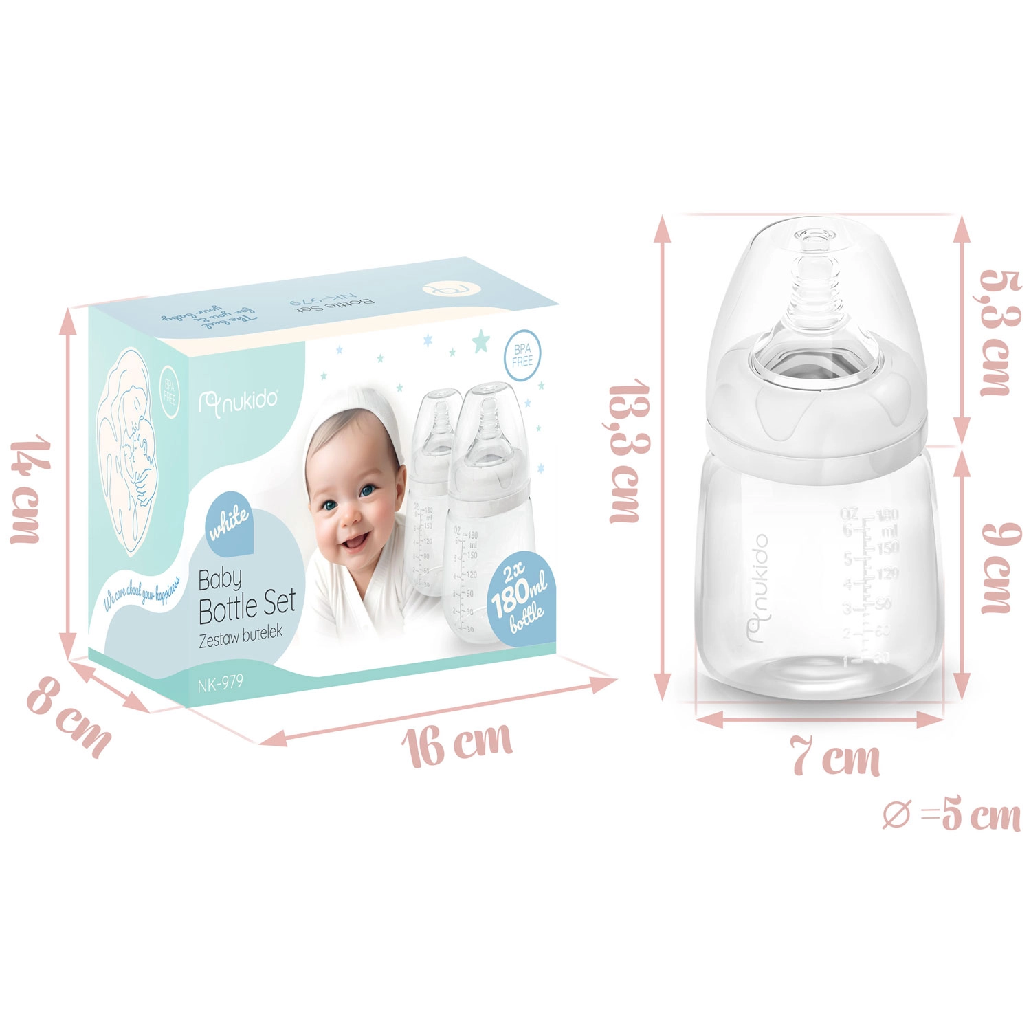 Praktičen komplet dveh dojenčkih stekleničk s prostornino 180 ml iz varnega polipropilena za vsakodnevno hranjenje. Stekleničke so lahke, enostavne za držanje in imajo čitljive merilne oznake, širok vrat za enostavno čiščenje ter dinamičen silikonski cuclj, ki posnema gibanje materine bradavice. So brez BPA, združljive z dojilnimi črpalkami NUKIDO in primerne za pomivanje v pomivalnem stroju ali ročno.