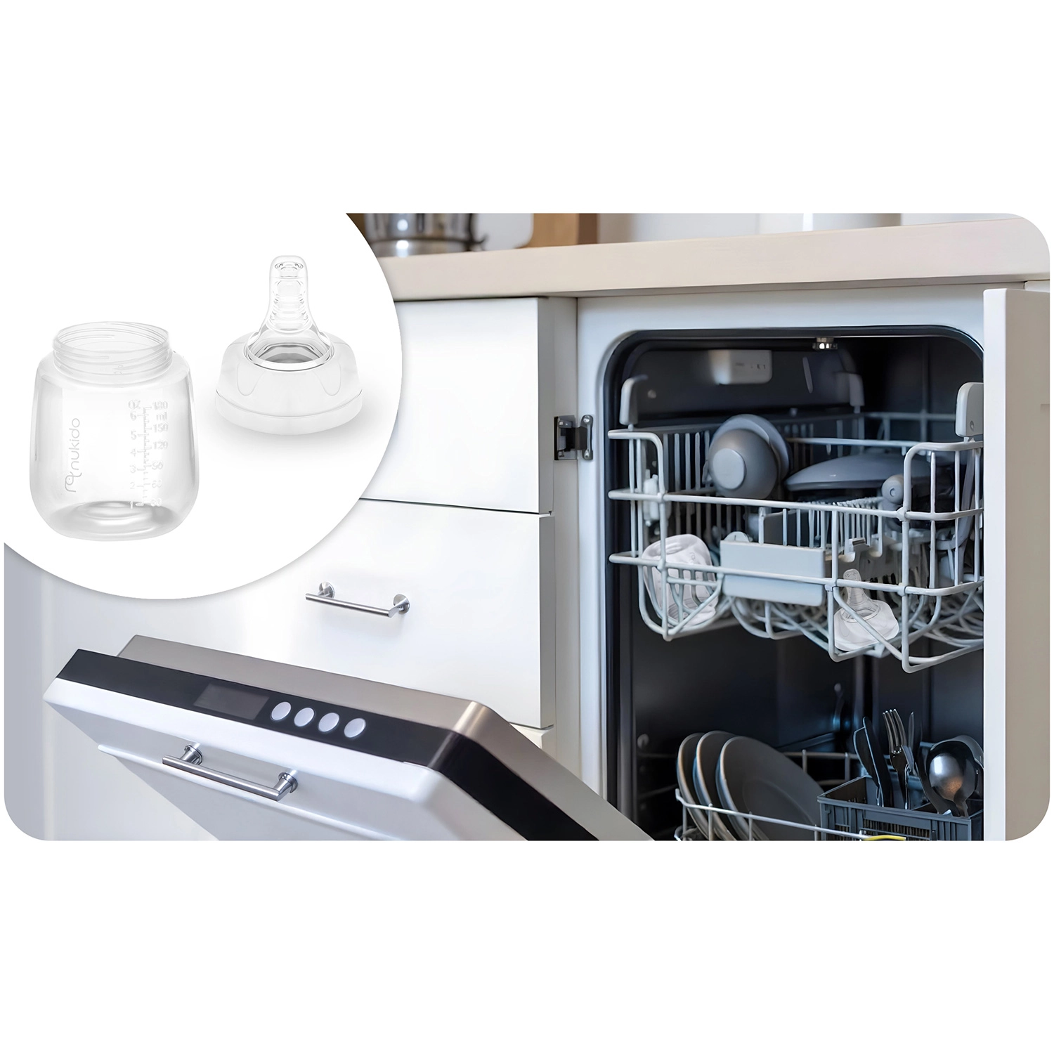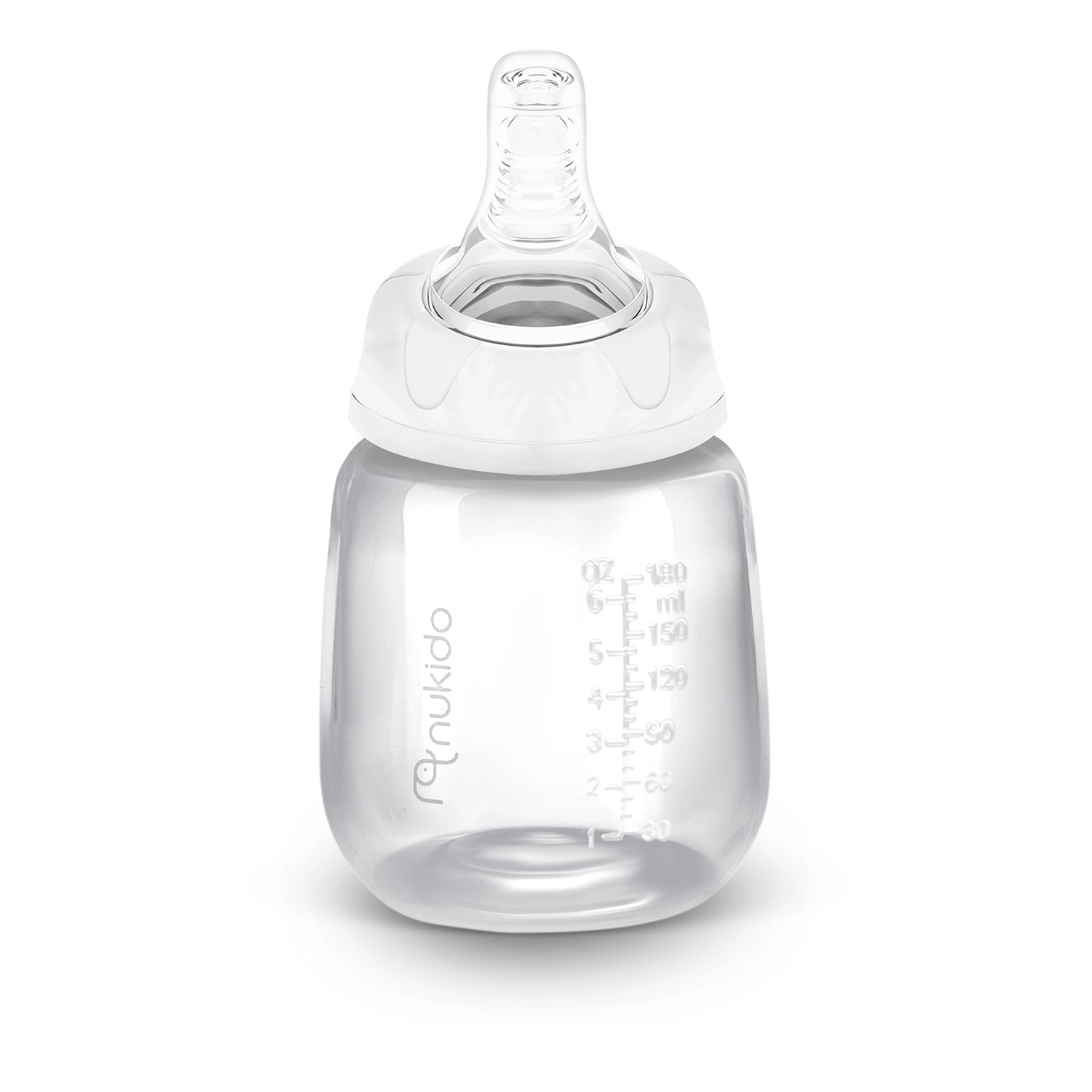 Komplet NUKIDO prinaša dve trpežni in večkrat uporabni steklenički s prostornino 180 ml, izdelani iz lahkega in nelomljivega polipropilena. Zahvaljujoč širokemu vratu sta polnjenje in čiščenje hitra in higienska, čitljive oznake pa omogočajo natančno odmerjanje. Priloženi so pokrovčki in zaporke proti iztekanju, zato lahko mleko ali kašasto hrano varno shranite tudi na poti.