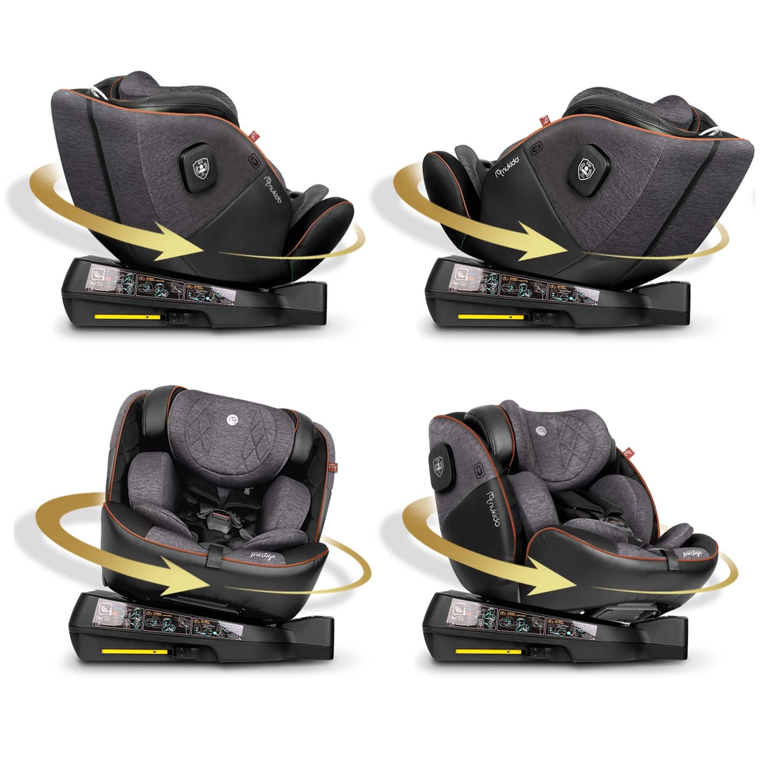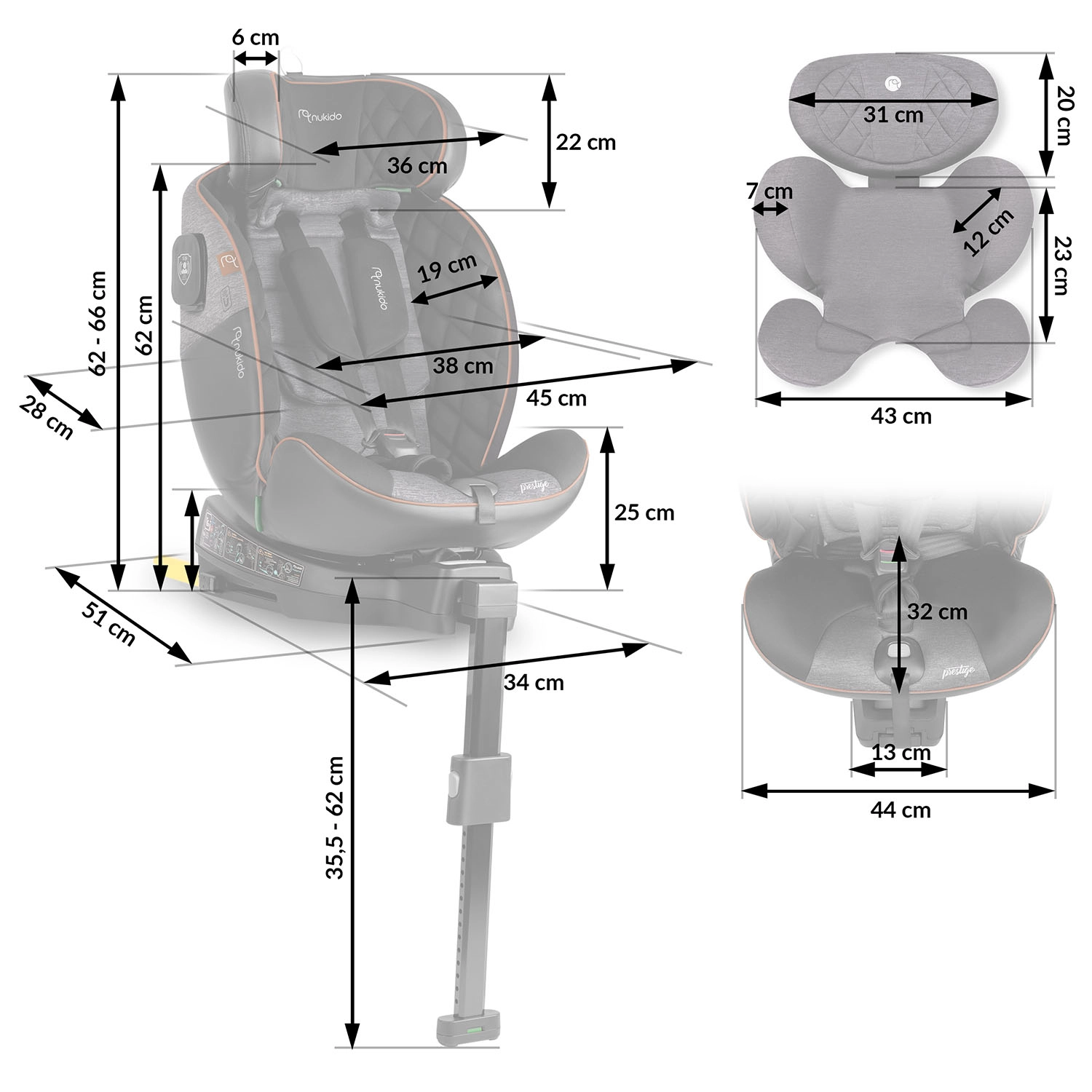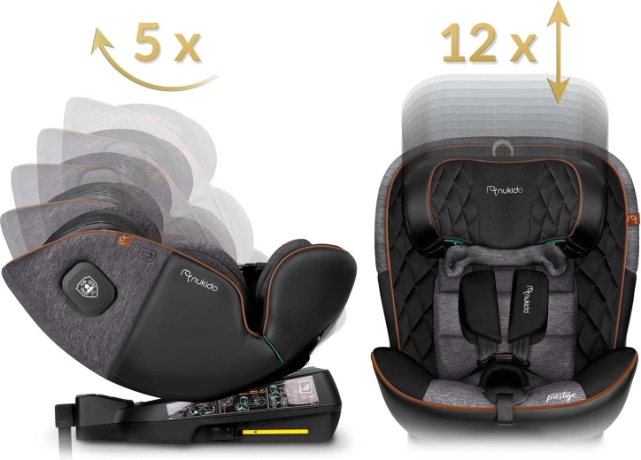 Avtosedež Nukido Prestige Line je zasnovan po standardu ECE R129 i-Size za višino 40–150 cm in spremlja otroka od rojstva do približno 12 let. Zahvaljujoč vrtljivi osnovi 360° otroka zlahka pripnete bočno pri vratih, nato pa sedež zaklenete v želeni položaj. SIP – Side Impact Protection z ojačanimi bočniki ščiti glavo, vrat in hrbtenico pri bočnem trku, medtem ko ISOFIX in stabilizacijska noga zagotavljata trdno in hitro pritrditev.
