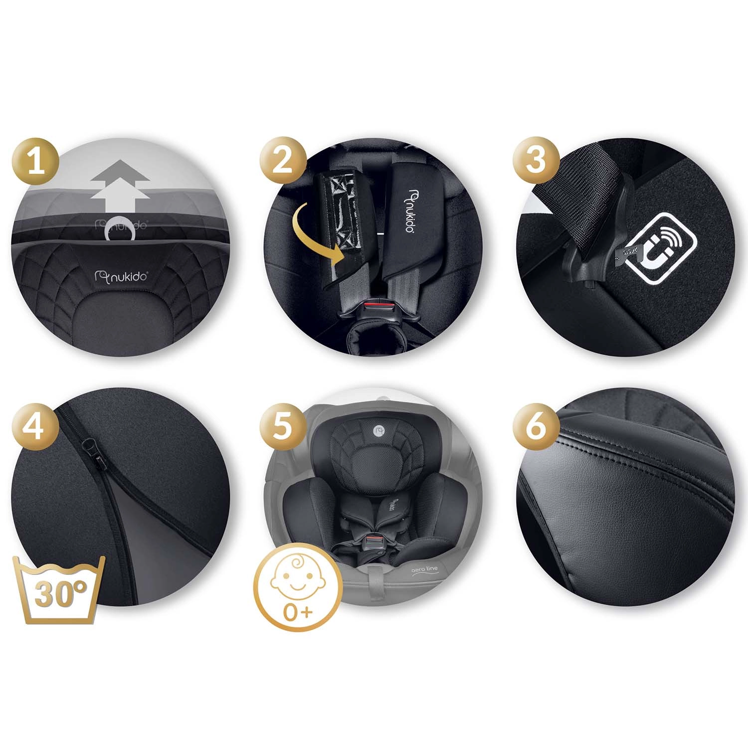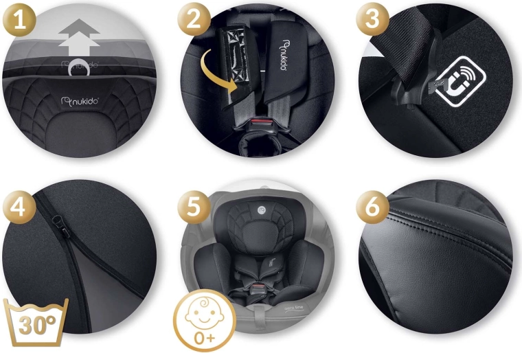 NUKIDO Aero Line je premium avtosedež, ki združuje najvišje varnostne standarde i-Size z dolgotrajnim udobjem od rojstva do približno 12 let. Zahvaljujoč vrtljivemu sistemu 360° otroka zlahka pripnete s strani in izberete smer vožnje RWF/FWF glede na starost in višino. Mehko prešito oblazinjenje, ergonomska zasnova in vložek za novorojenčka zagotavljajo udobje tudi na daljših poteh.