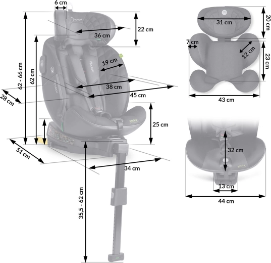Napredna SIP – Side Impact Protection s stranskimi blažilniki energije, oporna noga in čvrste ISOFIX sidrne točke zagotavljajo stabilnost in zaščito ob trku. 12-stopenjski vzglavnik raste z otrokom, 5 položajev nagiba povečuje udobje spanca, pettočkovni pasovi z nedrsečimi prevlekami pa varno ostanejo na mestu. Snemljiva prevleka je pralna za enostavno vzdrževanje.