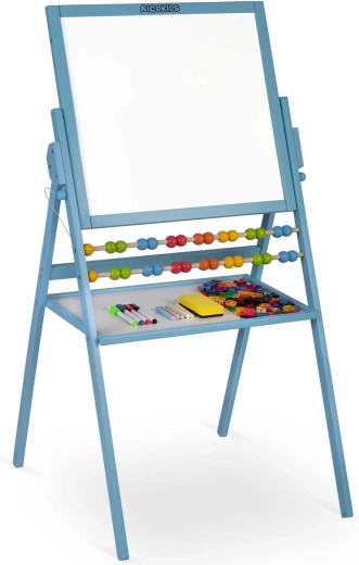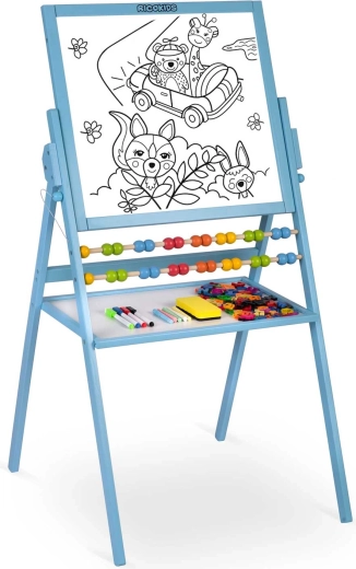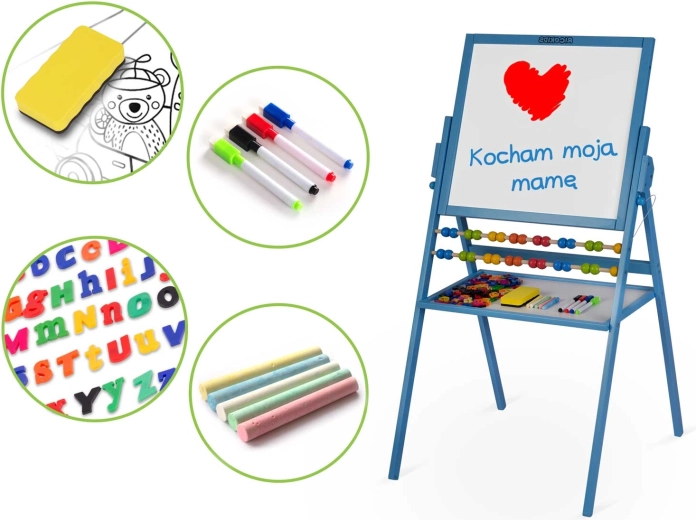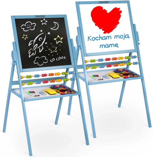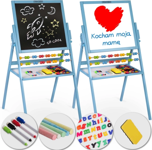 Velika, multifunkcionalna otroška tabla znamke RICOKIDS združuje kredo in magnetno belo stran v enem vrtljivem okvirju. Zahvaljujoč stabilni leseni konstrukciji, vgrajenemu abaku in bogatemu kompletu dodatkov (krede, flomastri, gobica, magnetne črke in številke) spodbuja ustvarjalnost, učenje in zabavo – vse varno in s certifikatoma CE, EN 71.