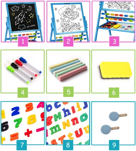 Sestavni del je barvit abak, ki na zabaven način razvija logiko in pomaga pri prvih računskih nalogah. Bogat komplet dodatkov – flomastri, krede, gobica, magnetne črke in številke – omogoča takojšnjo igro in učenje brez dodatnih nakupov.