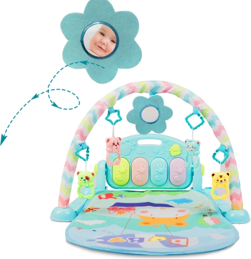 Ropotuljice, šumeči elementi in cvetlično ogledalce spodbujajo prijemanje, vizualno sledenje in koordinacijo oko–roka. Igrače so odstranljive in jih je mogoče poljubno preurediti.