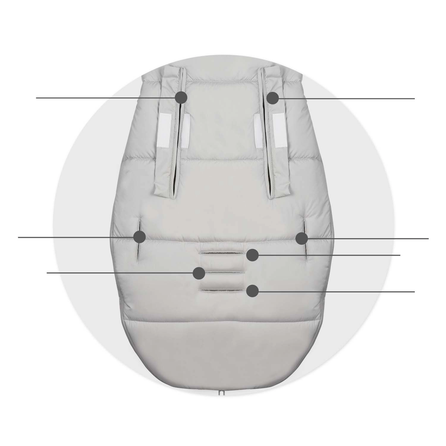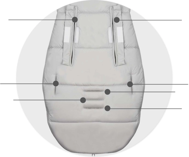 Združljiva z 2-/3-/5-točkovnimi pasovi in opremljena s protidrsnim elementom. Enostavno se prilega večini vozičkov in ostane stabilna tudi med vožnjo.