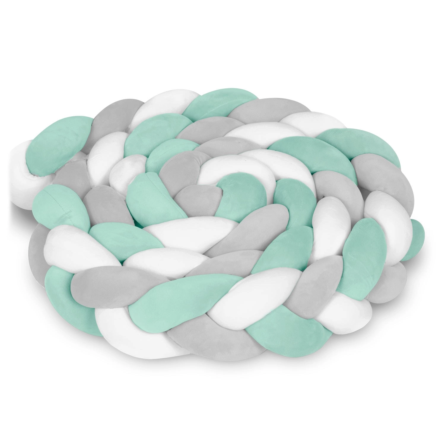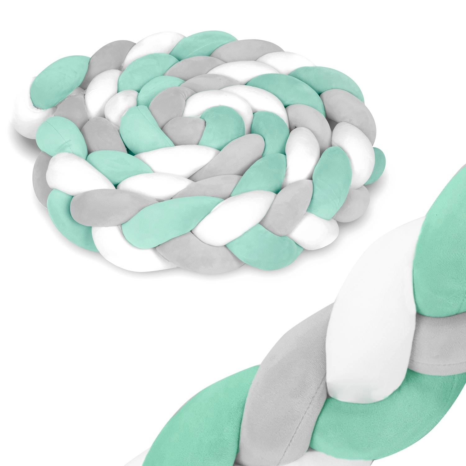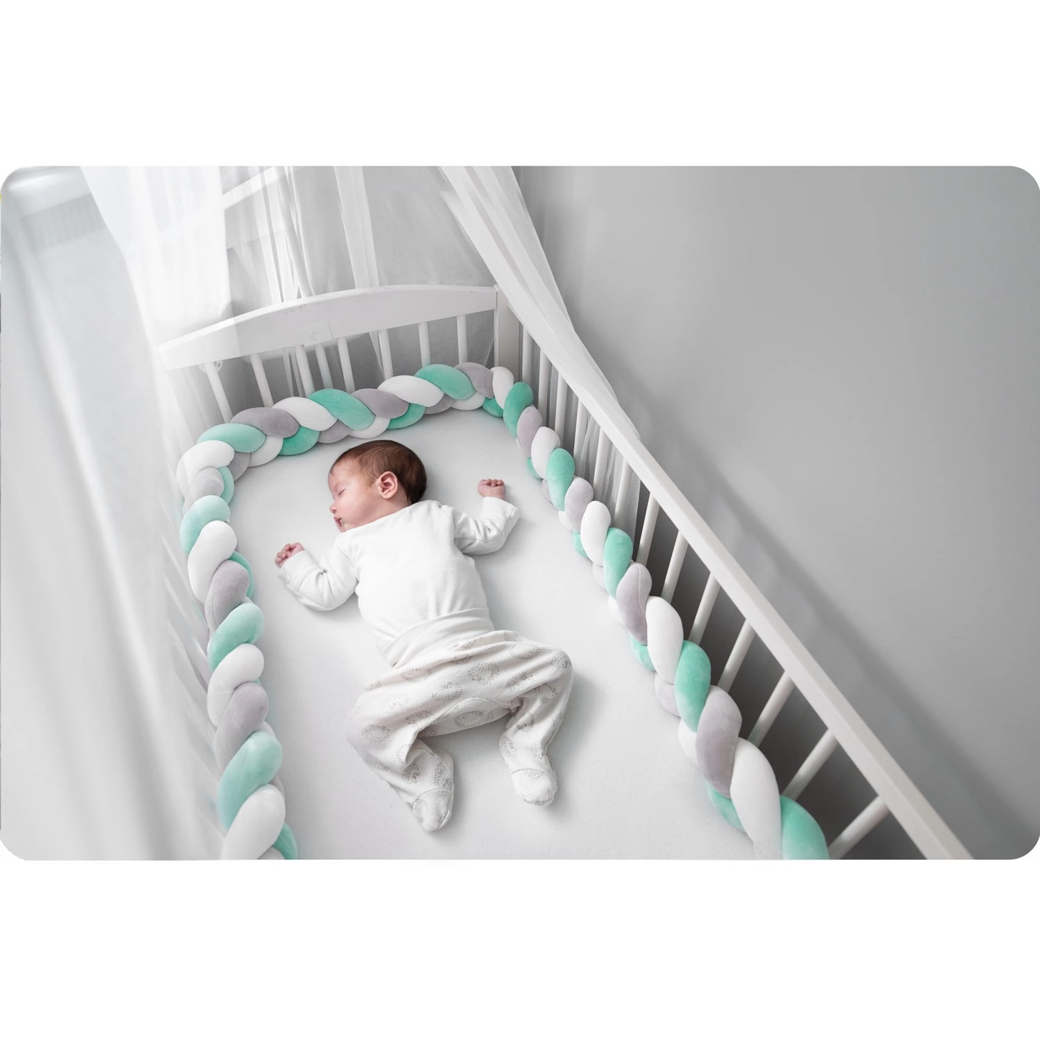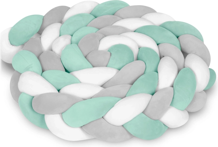 Pletena obposteljna kača v sodobni mentolno–sivi kombinaciji ustvari mehko, varno pregrado vzdolž robov posteljice. Zahvaljujoč prijetnemu, hipoalergenskemu materialu brez ostrih delov je nežna do otroške kože in primerna že za novorojenčke. Gosto prešitje in puhasta polnitev blažita udarce ter zapolnjujeta reže med letvicami.