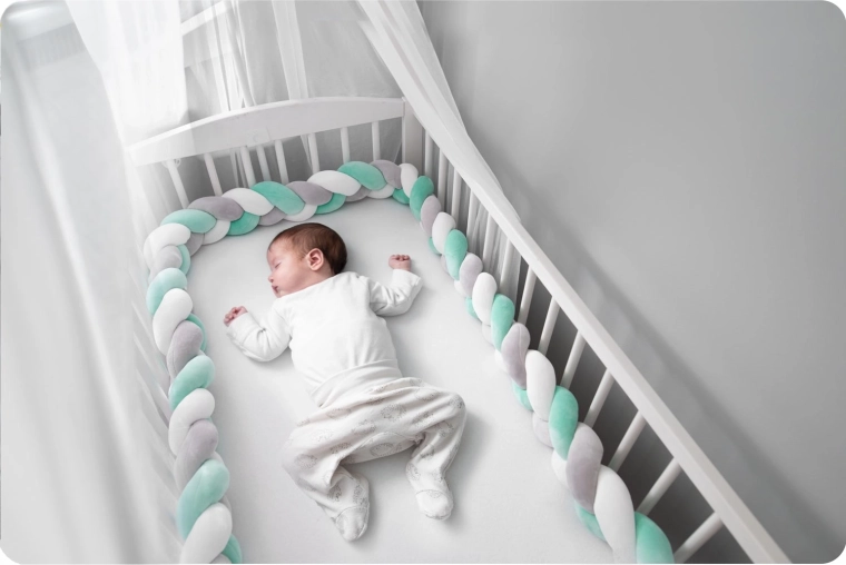 Mehak, antialergijski material brez ostrih delov ščiti dojenčka pred udarci ob letvice in ustvarja mirno, prijetno okolje v posteljici.