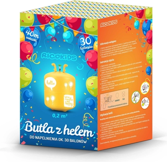 Komplet vsebuje 0,20 m³ helija, 30 barvnih balonov in 40 m dekorativnega traku – pripravljeno za takojšnjo zabavo brez dodatnega iskanja pripomočkov.
