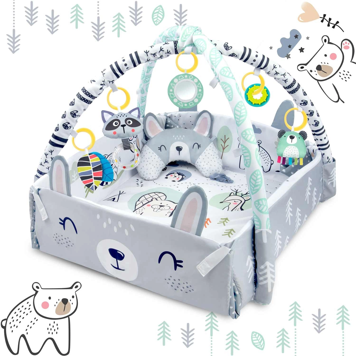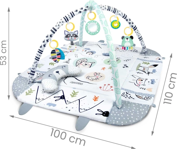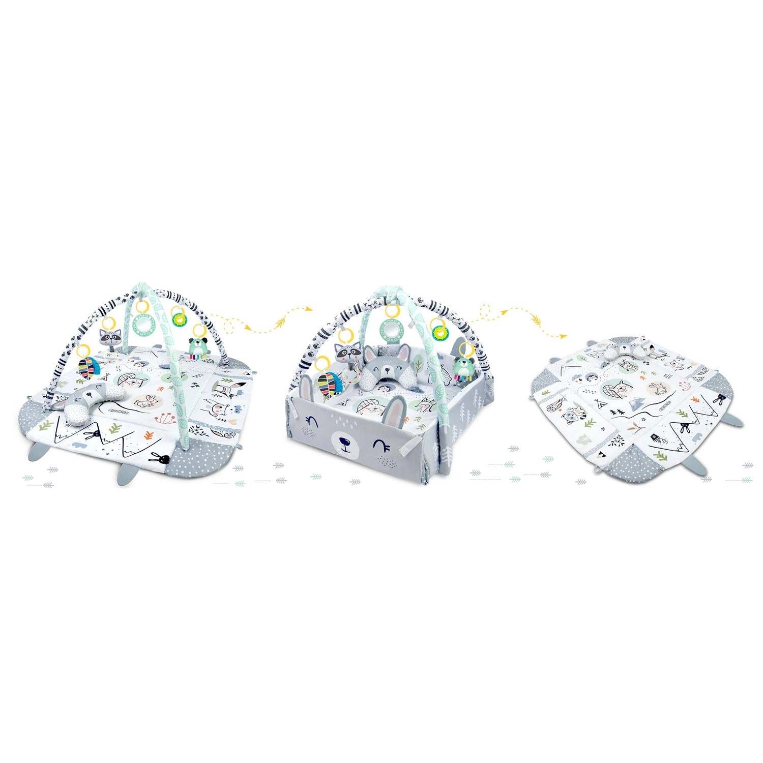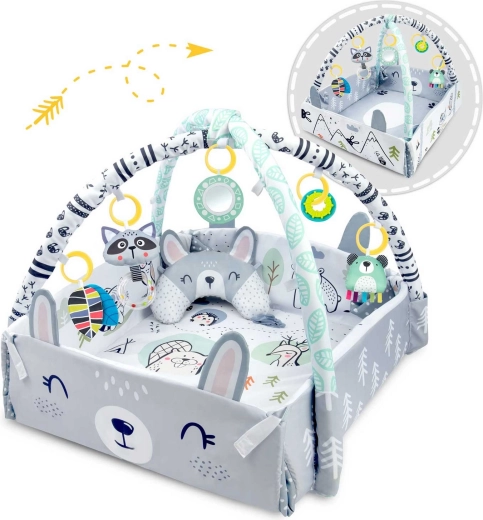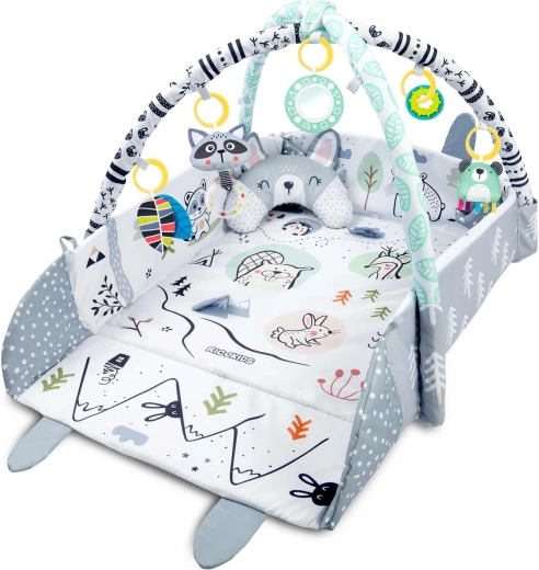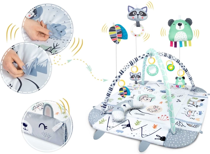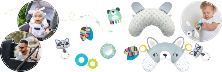 Del kompleta je 7 izvirnih igrač, vključno z zrcalcem, ropotuljicami, šumečimi elementi in piskajočo igračo s senzoričnimi trakovi. Igrače in oblazinjeni loki se lahko preprosto premestijo ali odstranijo. Vzglavnik za tummy time z mehko minky stranjo podpira pravilno položanje ter krepitev vratnih in hrbtnih mišic.