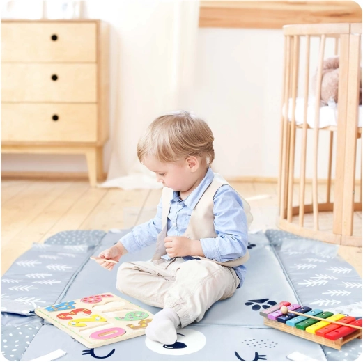 Praktične podrobnosti, kot so ježki, intuitivni ročaji in enostavno čistljiv, trpežen material, olajšajo vsakodnevno uporabo. Velikodušna dimenzija 110 × 100 cm zagotavlja svobodo gibanja, podloga pa kasneje služi tudi kot otroška preproga. Izdelek izpolnjuje standarde EN 71 in nosi oznako CE.