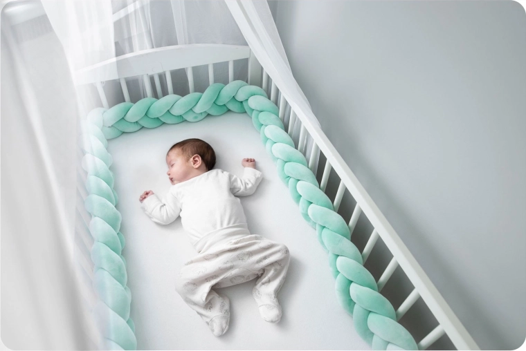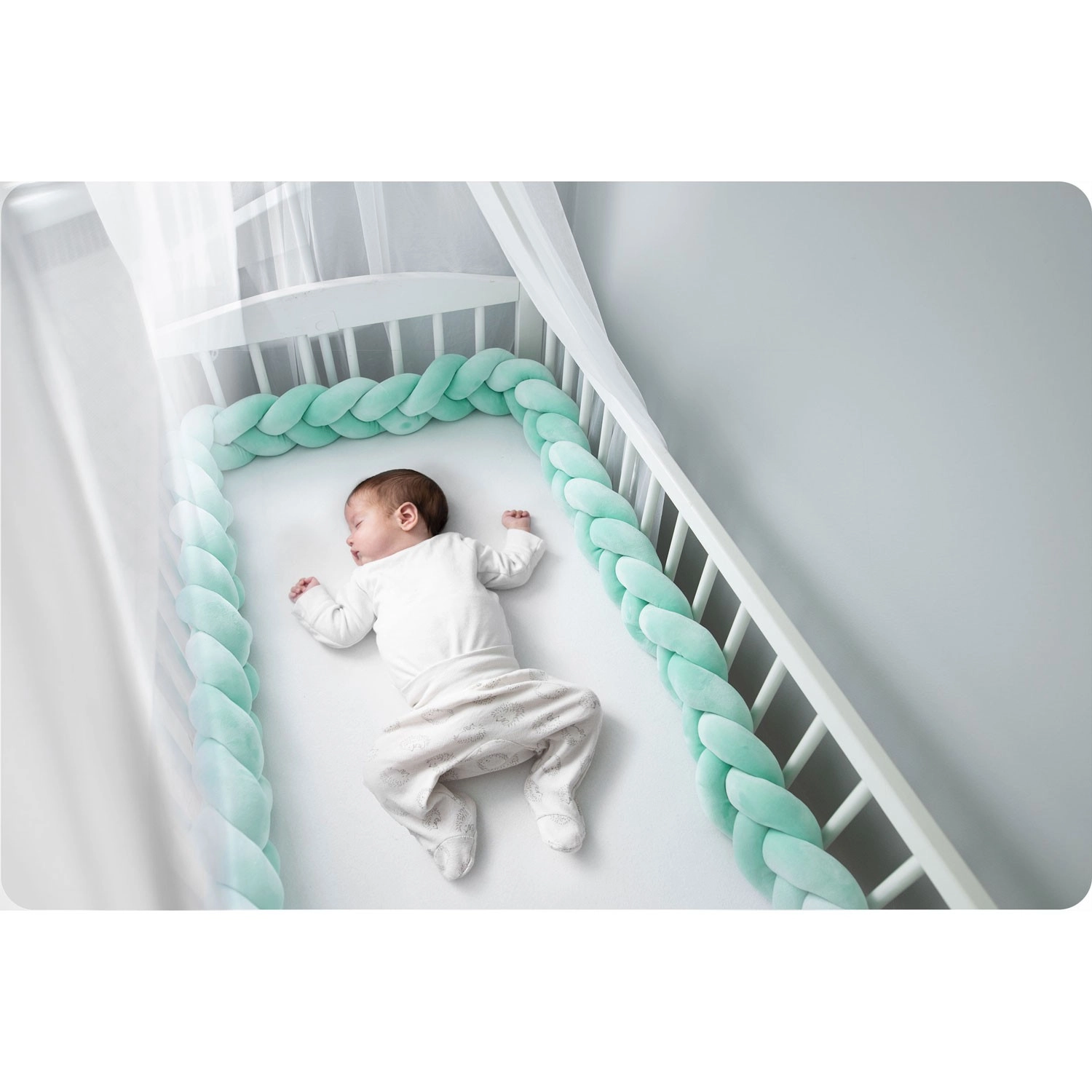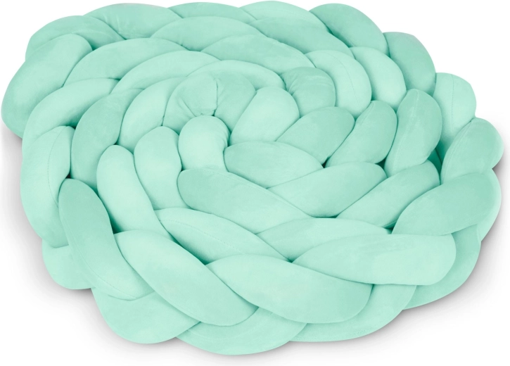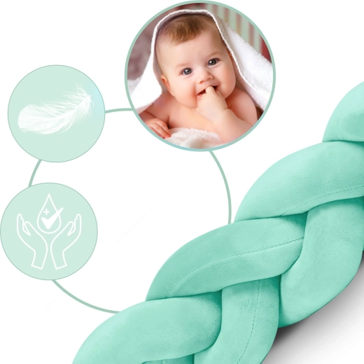Mehki in antialergijski pleteni obrobnik za otroško posteljico dolžine 3 m v sodobni mint barvi ščiti dojenčka pred trdimi letvicami, prepihom in mrazom od stene. Žameten na dotik, brez ostrih delov in pralen pri 30 °C za preprosto vzdrževanje.