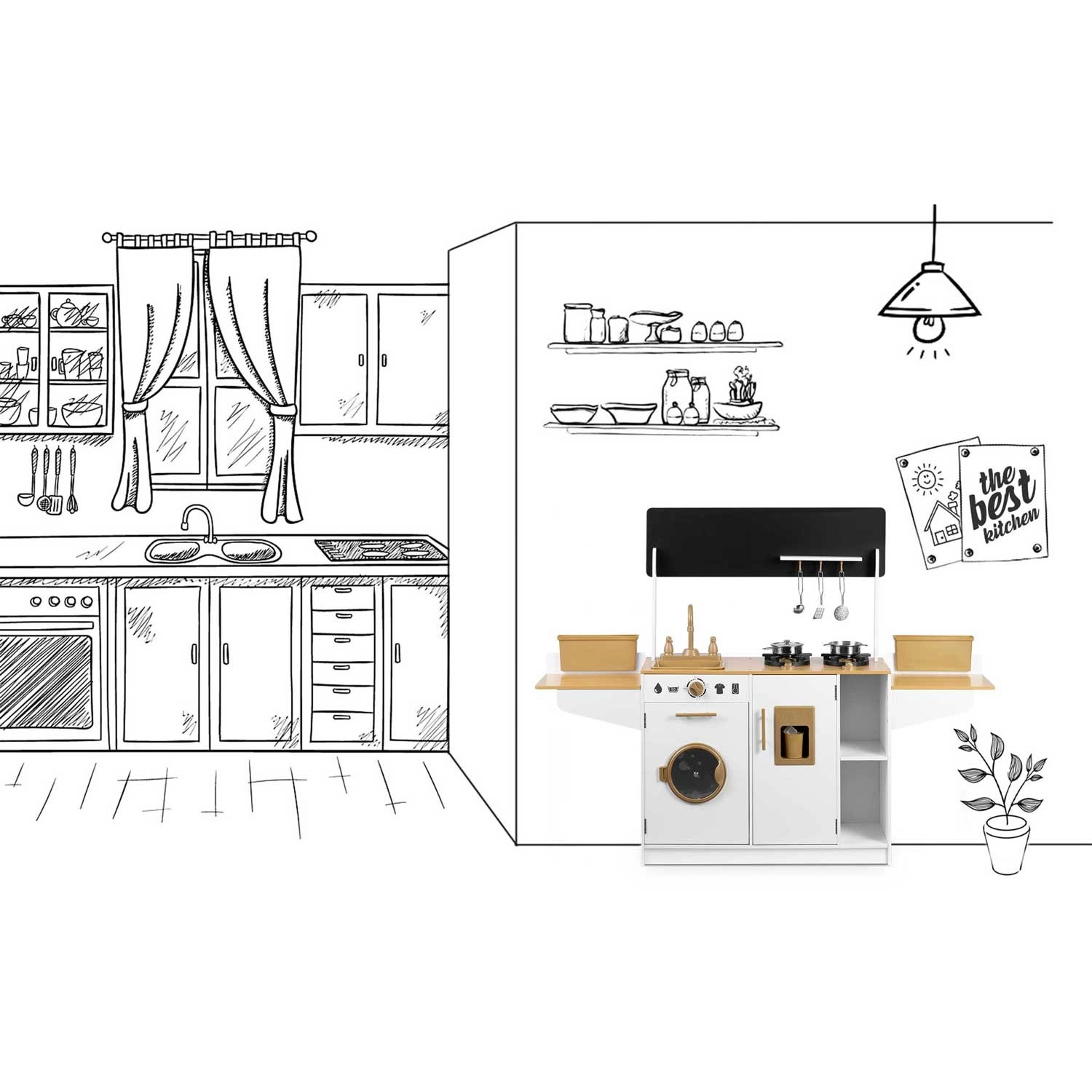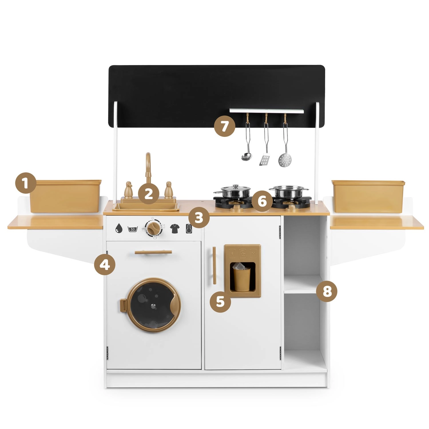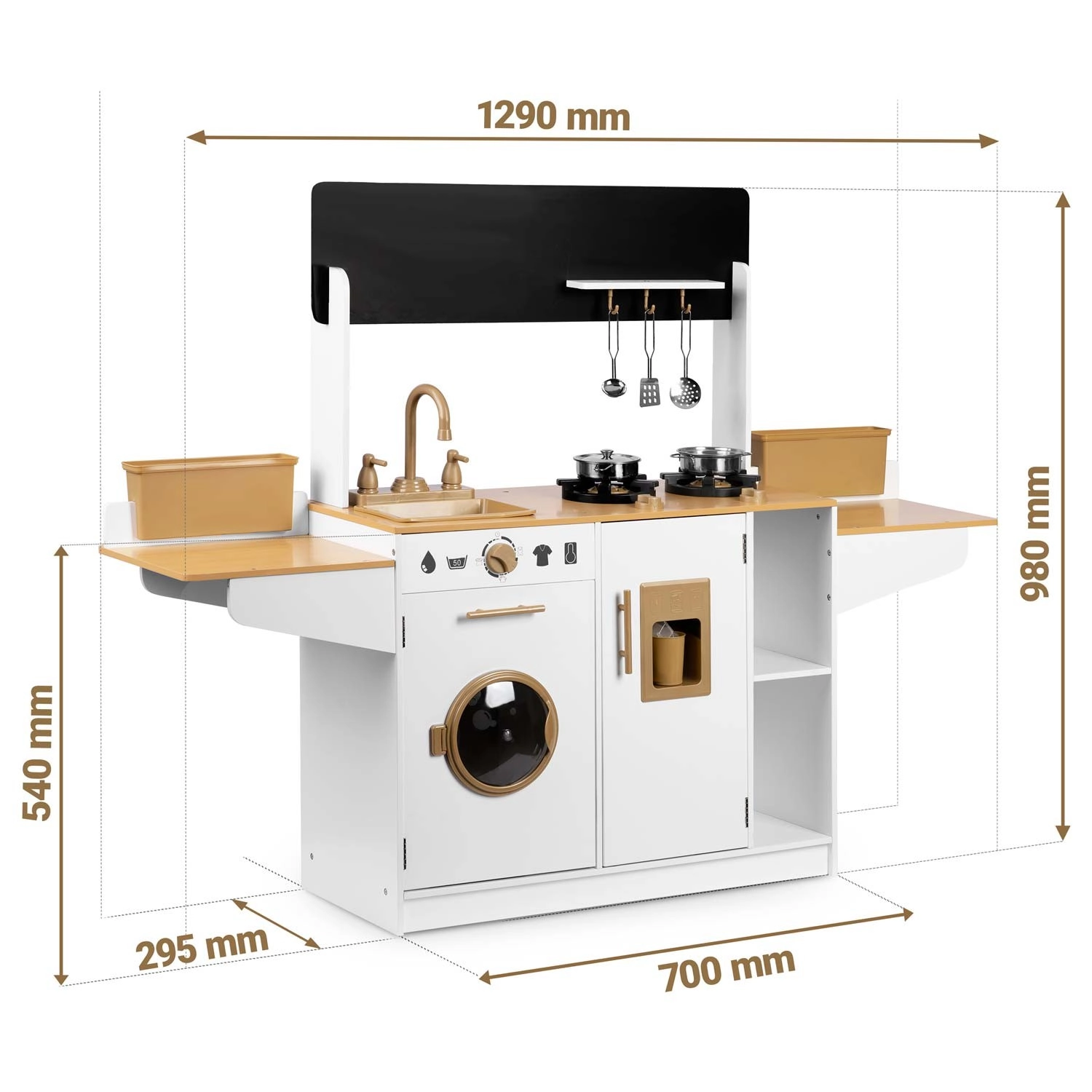 Lesena kuhinjica za otroke RICOKIDS prinaša realistične podrobnosti, ki navdušijo male kuharje in kuharice: delujoče gumbe, pomivalno korito s pipami, odpirajoča vratca in “aparate”, kot sta pralni stroj ter hladilnik z ledomatom. V kompletu je tudi set kovinskega posodja in visečih kuhinjskih pripomočkov.