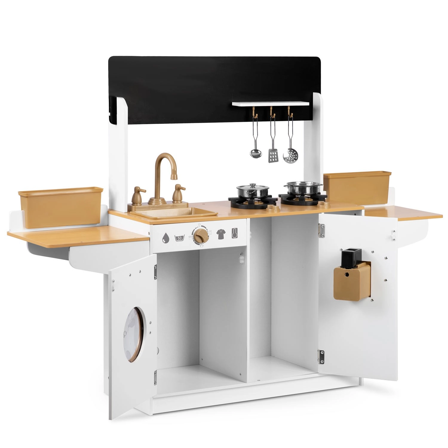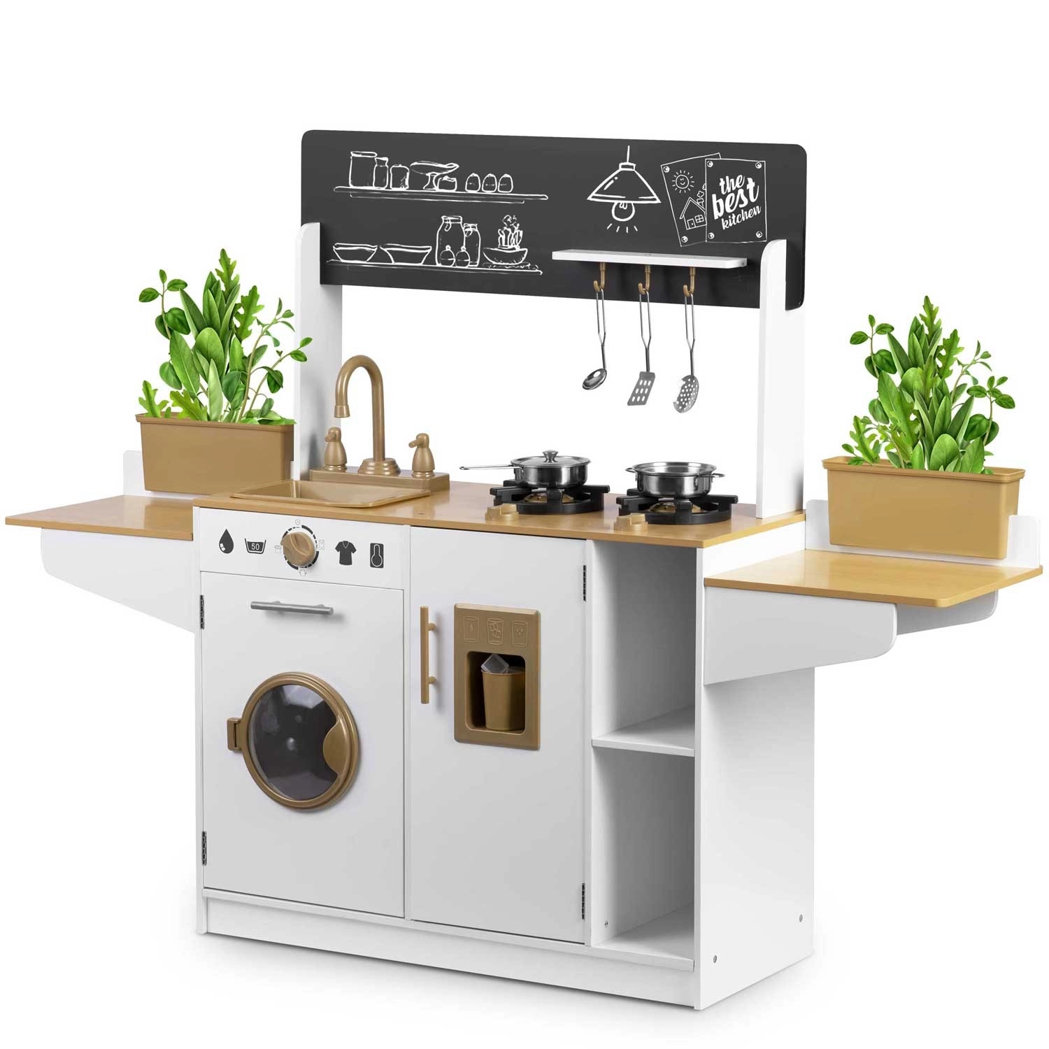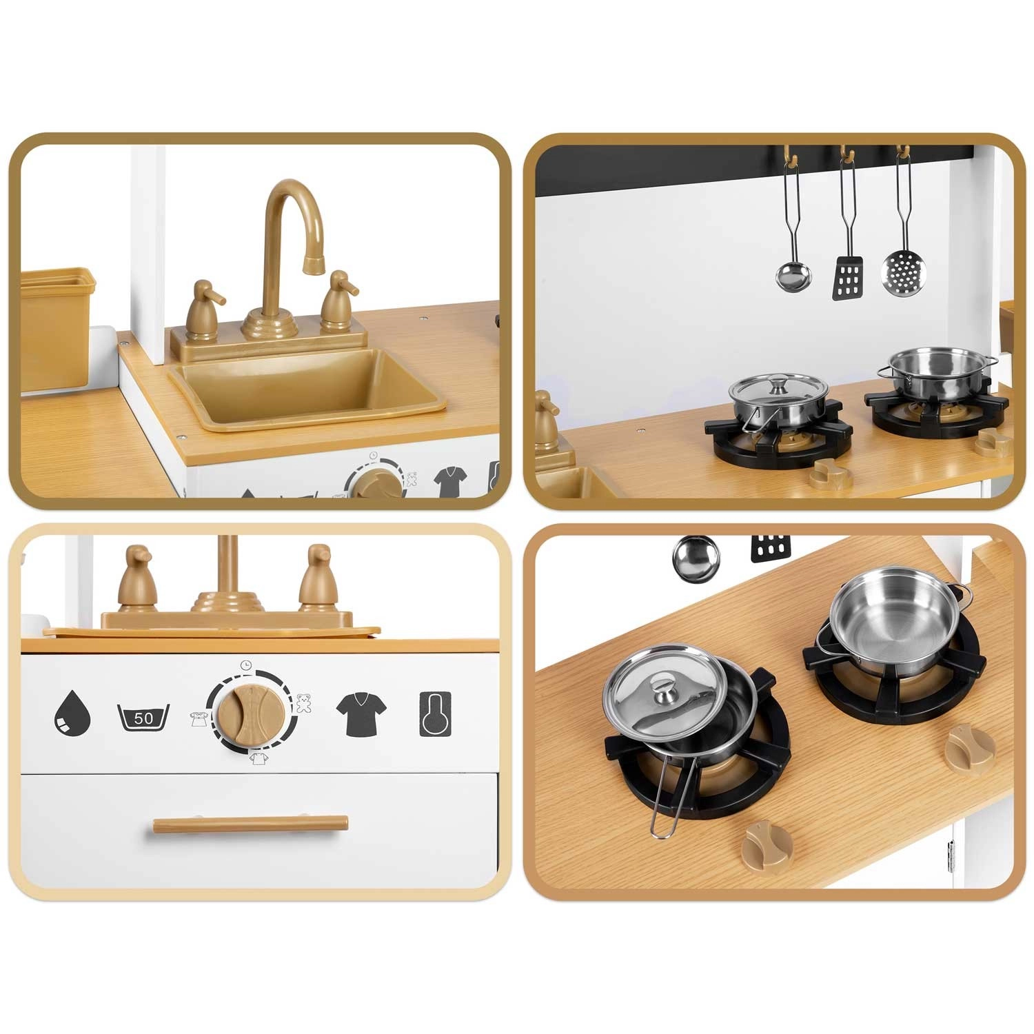 Lesena kuhinjica za otroke RICOKIDS prinaša realistične podrobnosti, ki navdušijo male kuharje in kuharice: delujoče gumbe, pomivalno korito s pipami, odpirajoča vratca in “aparate”, kot sta pralni stroj ter hladilnik z ledomatom. V kompletu je tudi set kovinskega posodja in visečih kuhinjskih pripomočkov.
