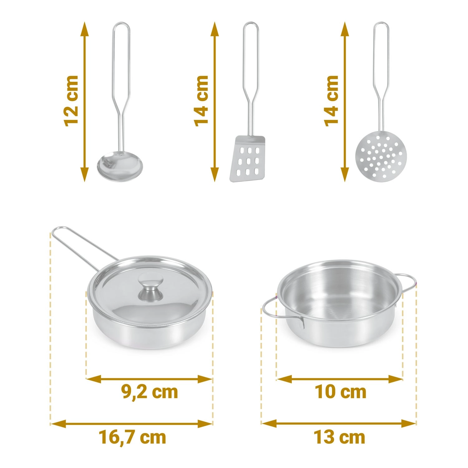 Dve kuhalni plošči z zvokom obračanja gumbov, kljukice za pripomočke in kovinski lonci spodbujajo domišljijo ter otrokom približajo pravo kuhanje.
