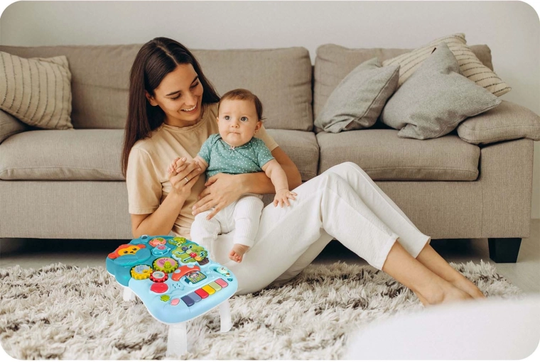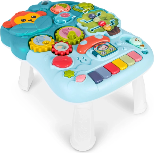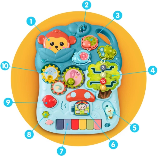 Gumbi, zobniki, drsniki, labirint in barvne tipke spodbujajo učenje barv, oblik in številk ter razvijajo fino motoriko in čute.