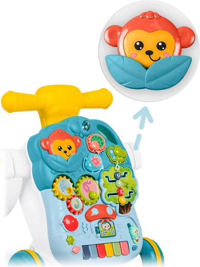 Odstranljiv panel je poln aktivnosti: barvno pianino, zatiči, zobata kolesca, gumbi s pesmicami in tolkalskimi zvoki, labirint z žičkami, uparjanje oblik, zvočni elementi in drugo. Otrok na zabaven način spoznava barve, oblike in številke ter razvija fino motoriko in koordinacijo oko–roka.