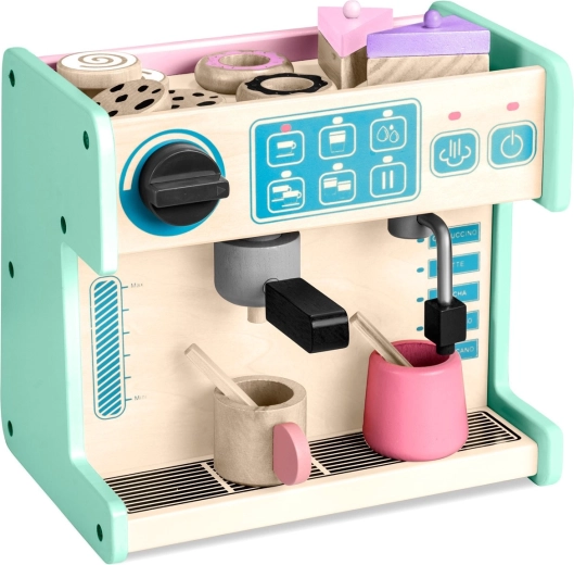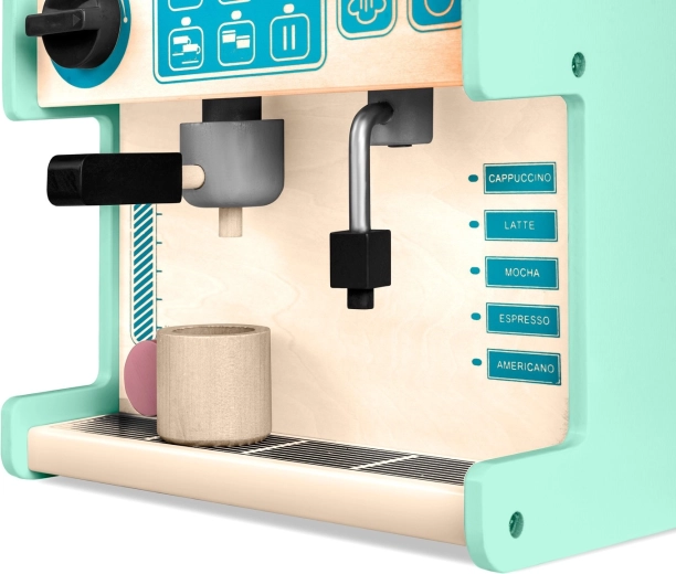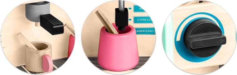 Premišljene podrobnosti, kot so portafilter, vrtljivi gumbi, parna šoba, skodelice in mešalke, povzdignejo igro v bolj realistično izkušnjo. Komplet je izdelan iz kakovostnega lesa z gladkimi robovi, uporablja varne, certificirane barve in izpolnjuje standarde EN, zato je idealen za otroke od 3 let naprej.
