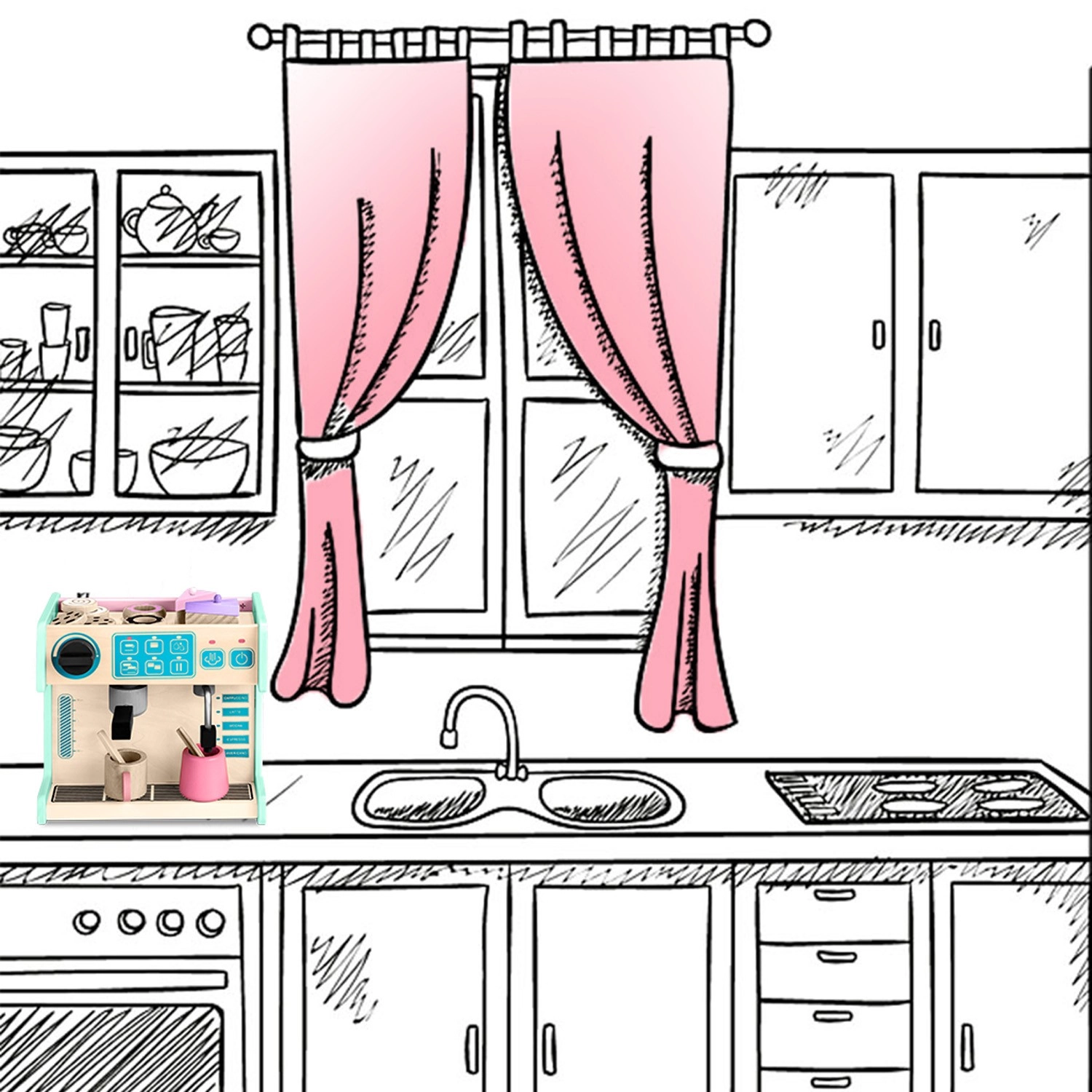 Ta lesena kavarna z espresso aparatom v priljubljenem mentolnem dizajnu združuje dve igri v eni — kavni bar in slaščičarno. Otroci lahko “pripravljajo” espresso, cappuccino ali latte ter hkrati strežejo lesene slaščice na elegantnem stojalu. Zaradi kompaktnih mer je set primeren tudi za na pot in ga je enostavno pospraviti.