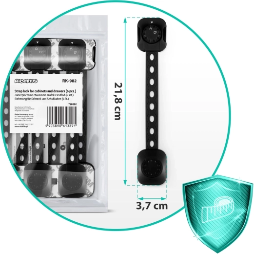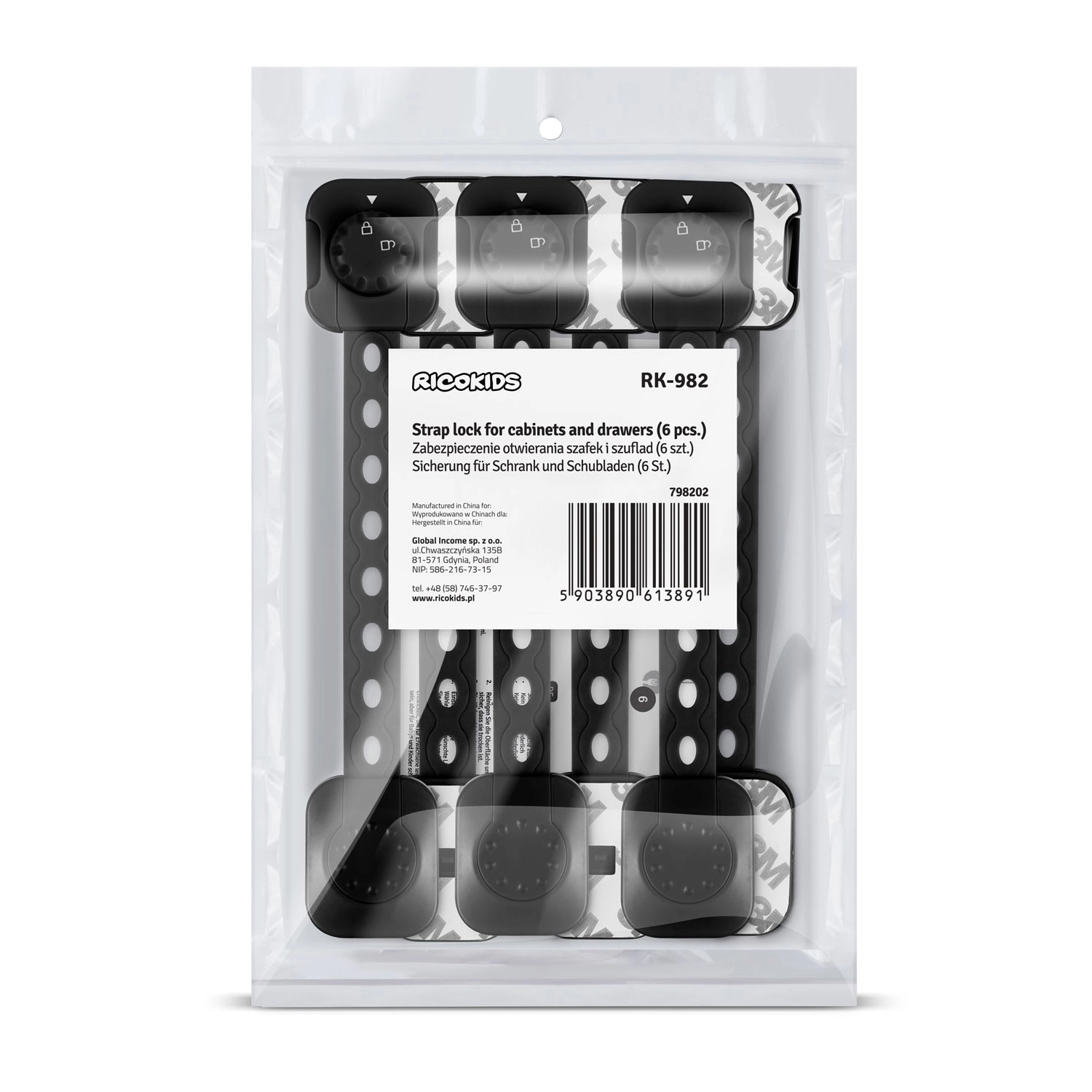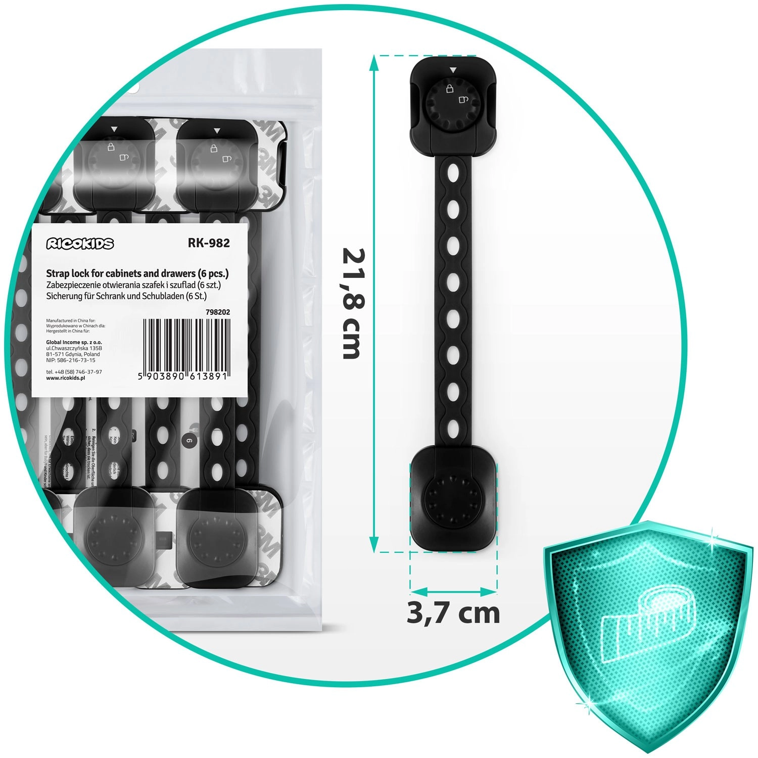 Varnostni trakovi RICOKIDS predstavljajo preprosto in estetsko rešitev za preprečevanje nenamernega odpiranja vratc in predalov s strani otrok. Zahvaljujoč fleksibilnemu pasu z več nastavitvenimi odprtinami preprosto prilagodite dolžino različnim tipom pohištva in aparatov. Močno lepilo 3M zagotovi trden oprijem brez vrtanja in brez tveganja poškodb površine.