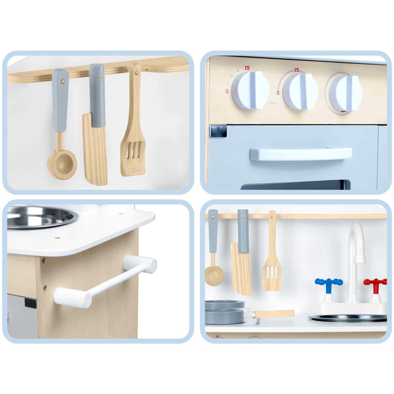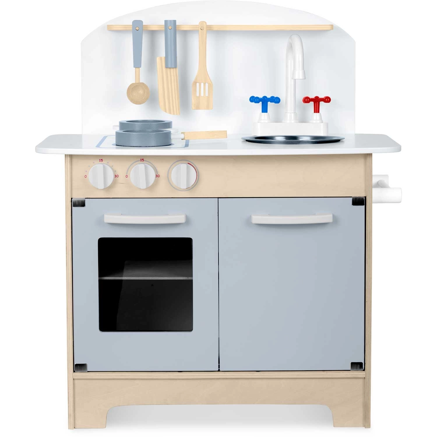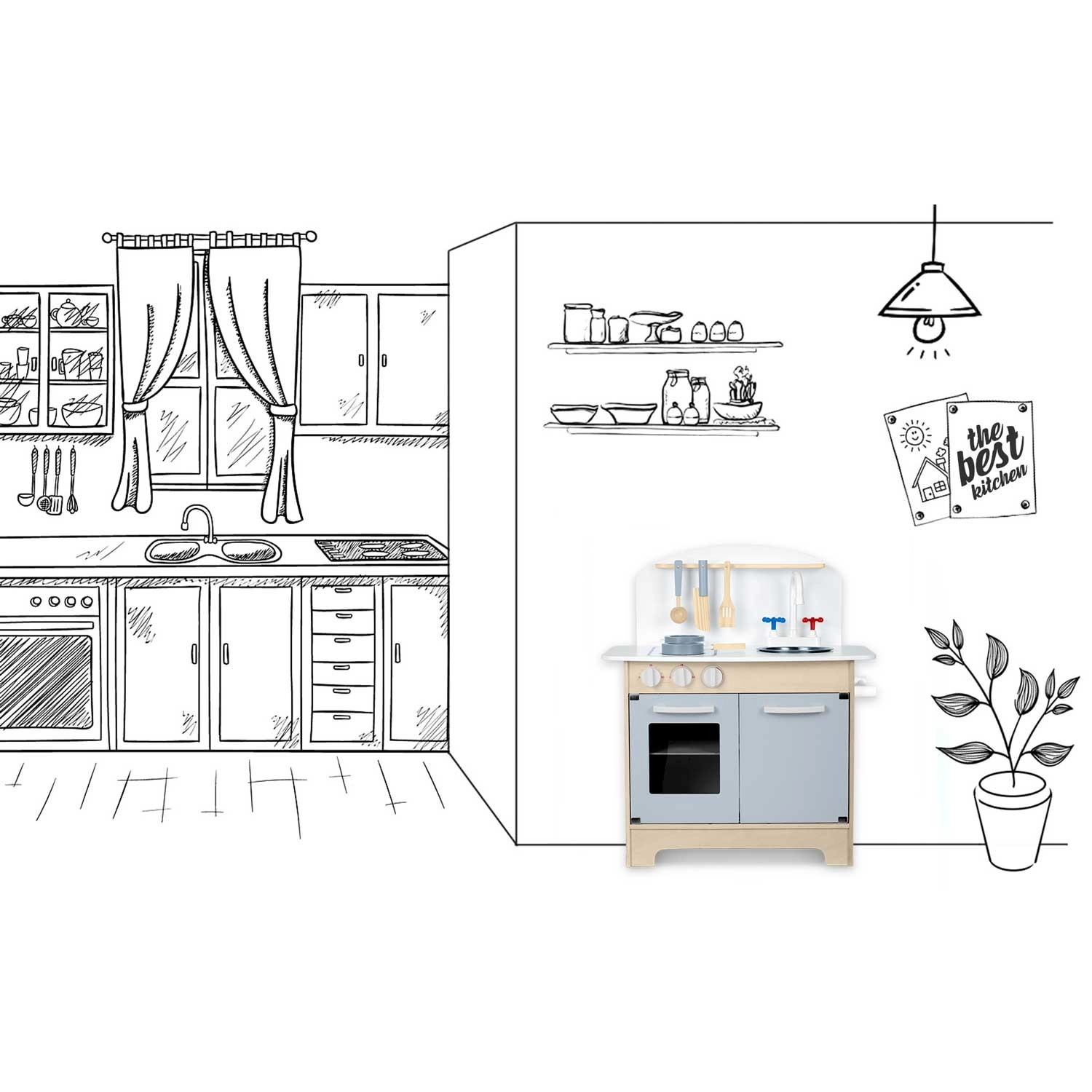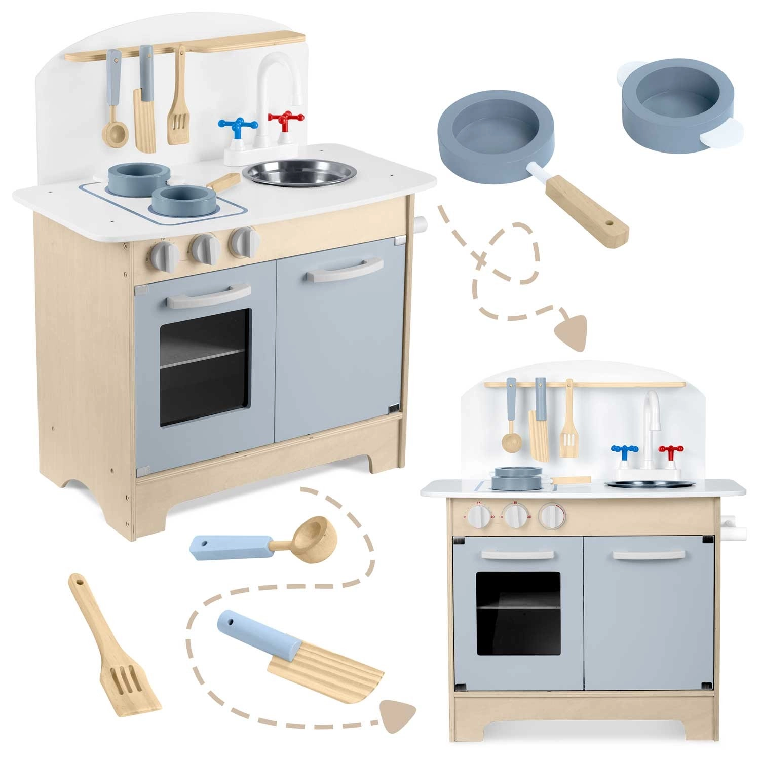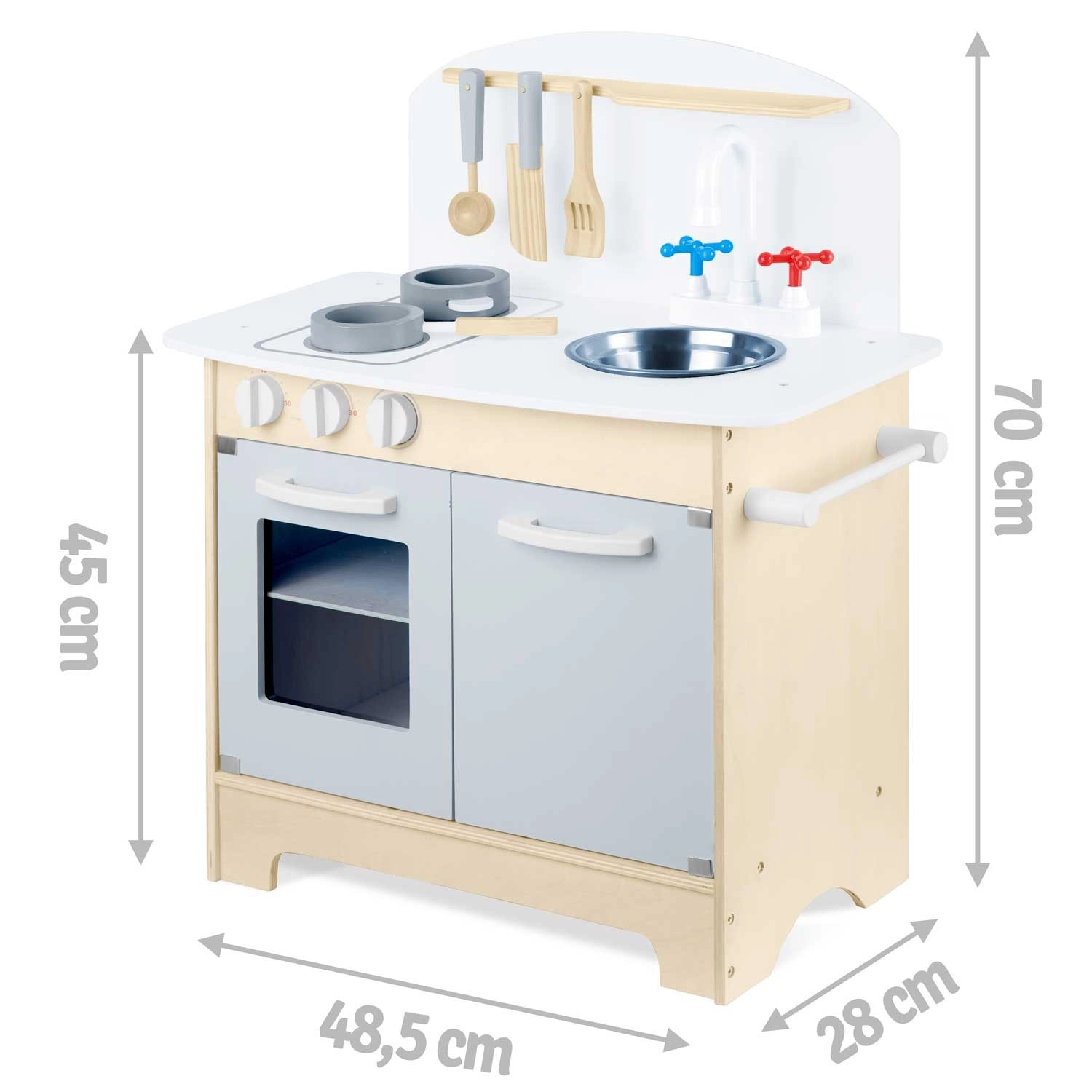 Premišljeni shranjevalni prostori, kot so omarica za posodo, police in kljukice za pripomočke ter držalo za papirnate brisače, poskrbijo za red med kuhanjem. Priložen je komplet dodatkov: lonec, ponev, žlica, lopatka in nož. Trdna lesena konstrukcija v minimalističnem retro slogu bo postala elegantna dekoracija otroške sobe.