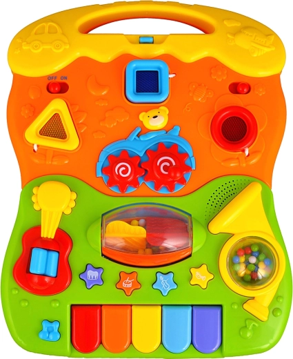 Odstranljiva plošča s pianinom, svetlečimi oblikami, prenosi, gumbi in ropotuljicami razvija čute in motoriko. Lahko se uporablja samostojno, ločeno od hodulje.