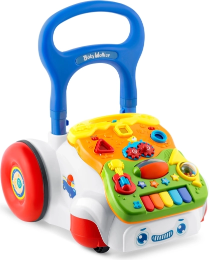 Odstranljiva edukativna plošča spremeni hoduljo v samostojno središče aktivnosti. Na njej boste našli pianino, 4 glasbila, svetleče oblike, prenose, premične in vrtljive elemente, različne gumbe ter zabaven hupač–ropotuljico. Plošča predvaja 10 melodij, ponuja plinsko nastavitev glasnosti in možnost izklopa luči in zvokov – odlično tudi za tišjo igro.