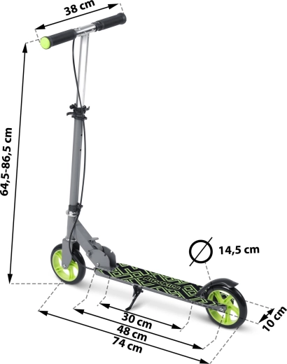 Lahek in kompakten otroški skiro RICO KIDS Kodi je idealen za male voznike od 3 do 8 let. Ponuja nastavljivo krmilo, velika PU kolesa 145 mm (83A) za gladko vožnjo, dve zavori – ročno in nožno za višjo varnost ter široko protizdrsno stopalko za stabilnost. Kakovostni ležaji ABEC‑7 zagotavljajo hitro, tiho in gladko vožnjo. Izpolnjuje standard EN 71.
