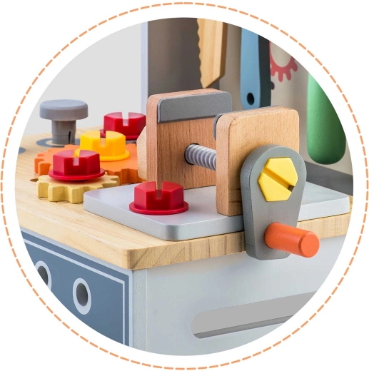 Odkrijte ustvarjalni svet malega mojstra z leseno delovno mizo RICOKIDS. Ta kakovosten komplet podpira fino motoriko, čutno zaznavanje in ustvarjalno igro po načelih Montessori. Vsebuje varno leseno orodje, vrtljiva zobata kolesa, primež in elemente za vijačenje, ki razvijajo spretnost in logično mišljenje.