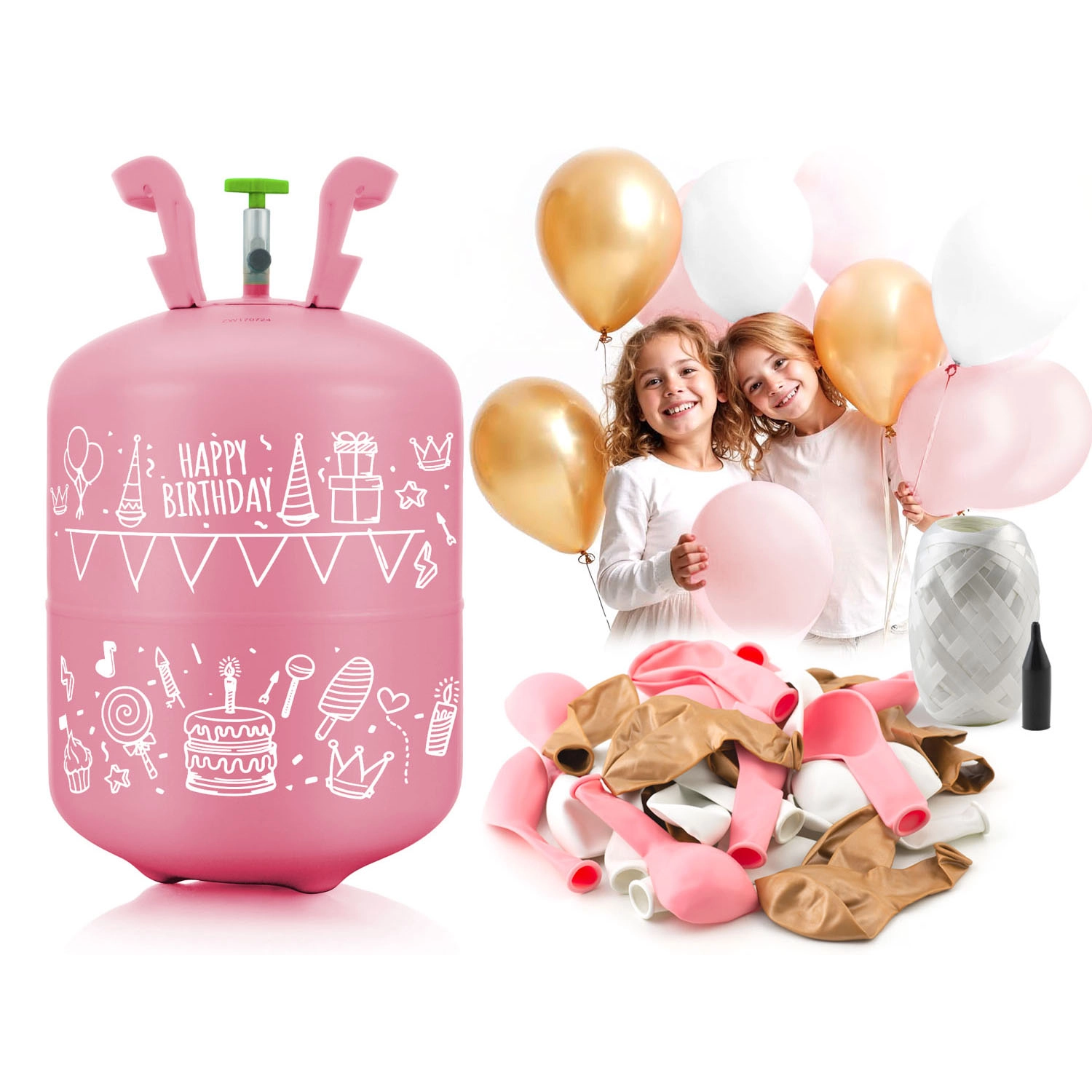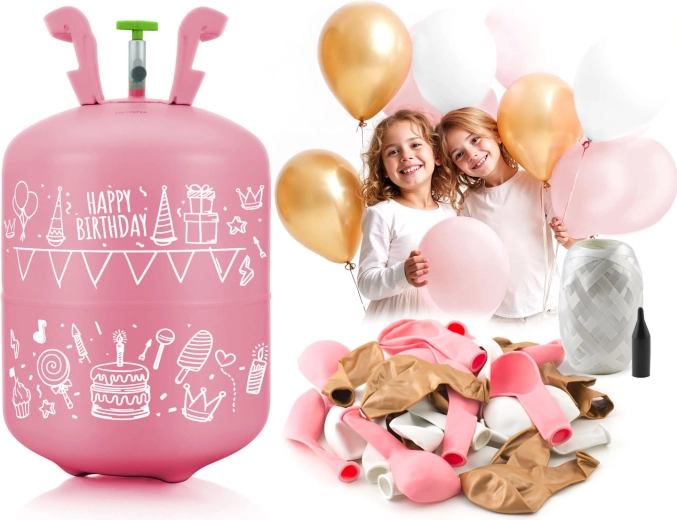 - Helijeva jeklenka, 30× lateks balon (bel, rožnat, zlat), 40 m dekorativnega traku, navodila in opozorila (PL), darilno pakiranje
