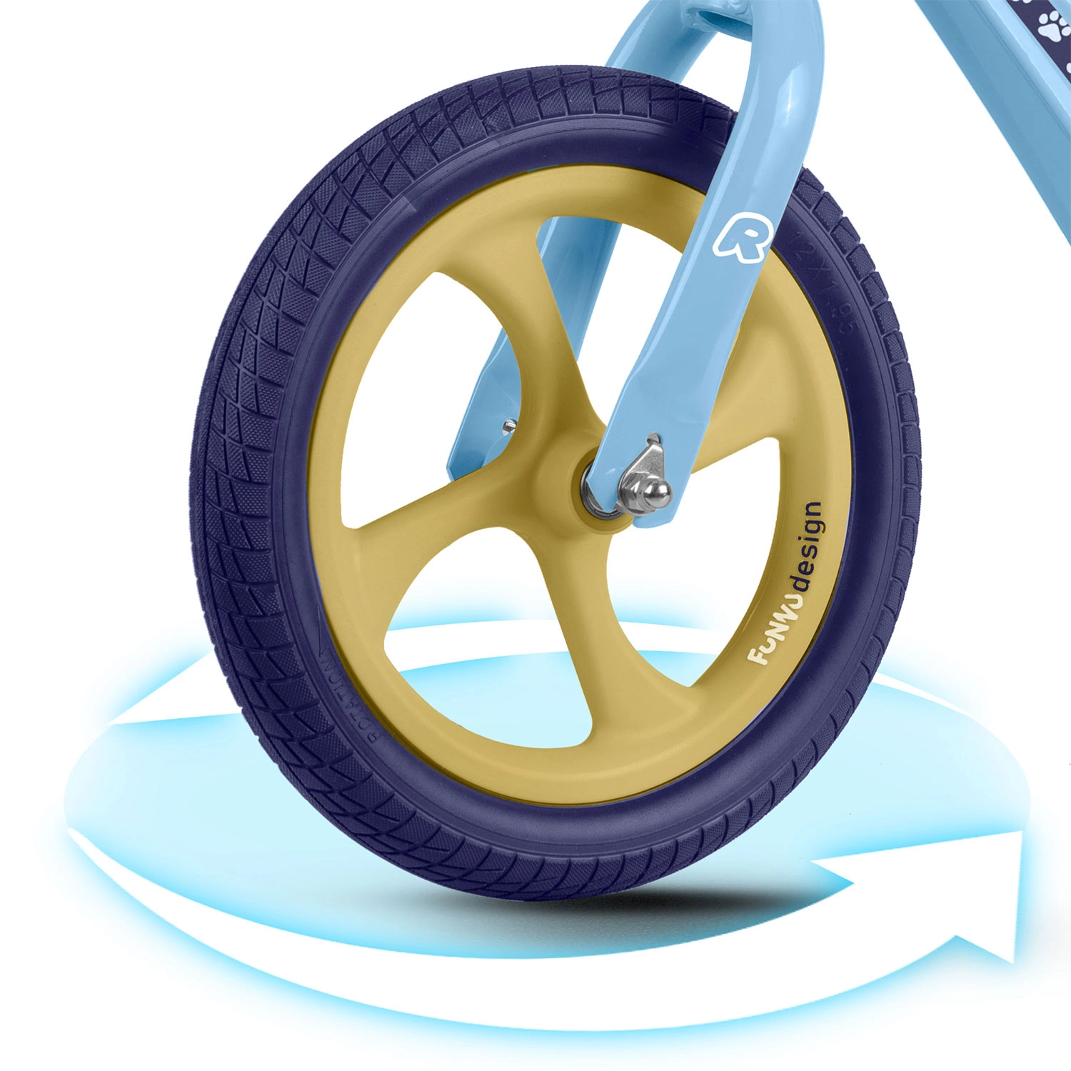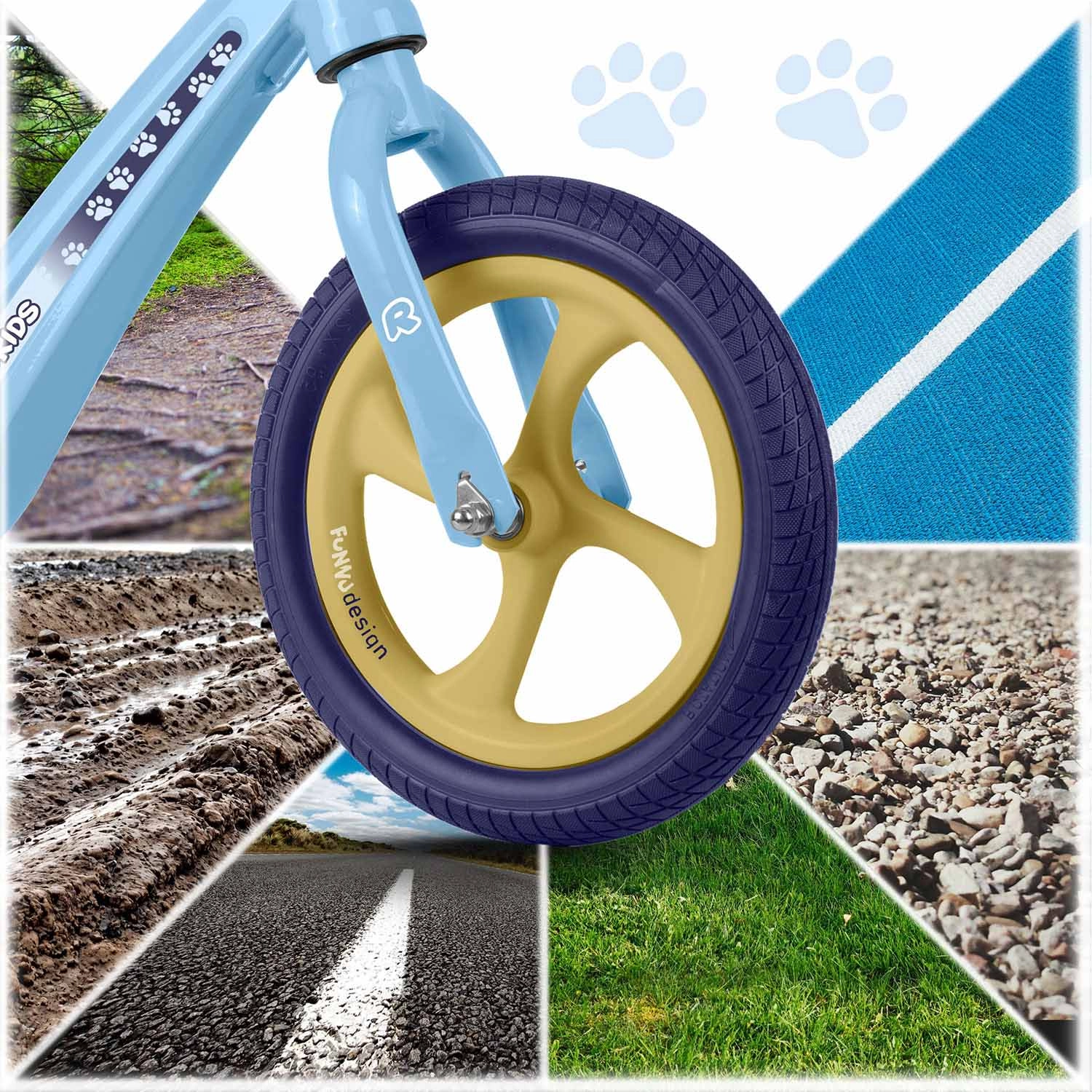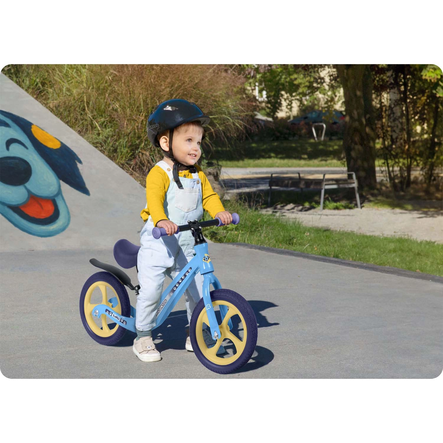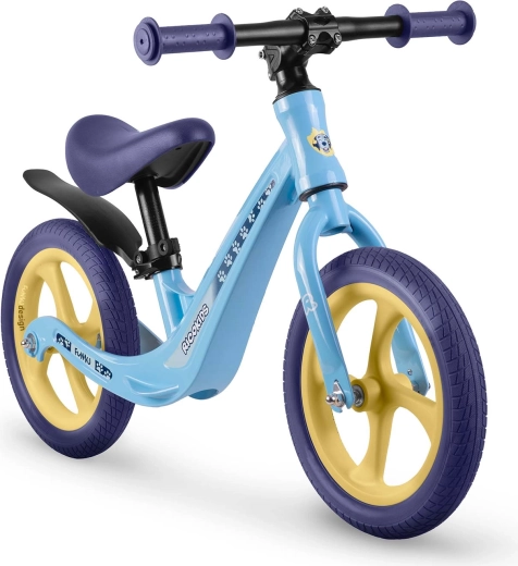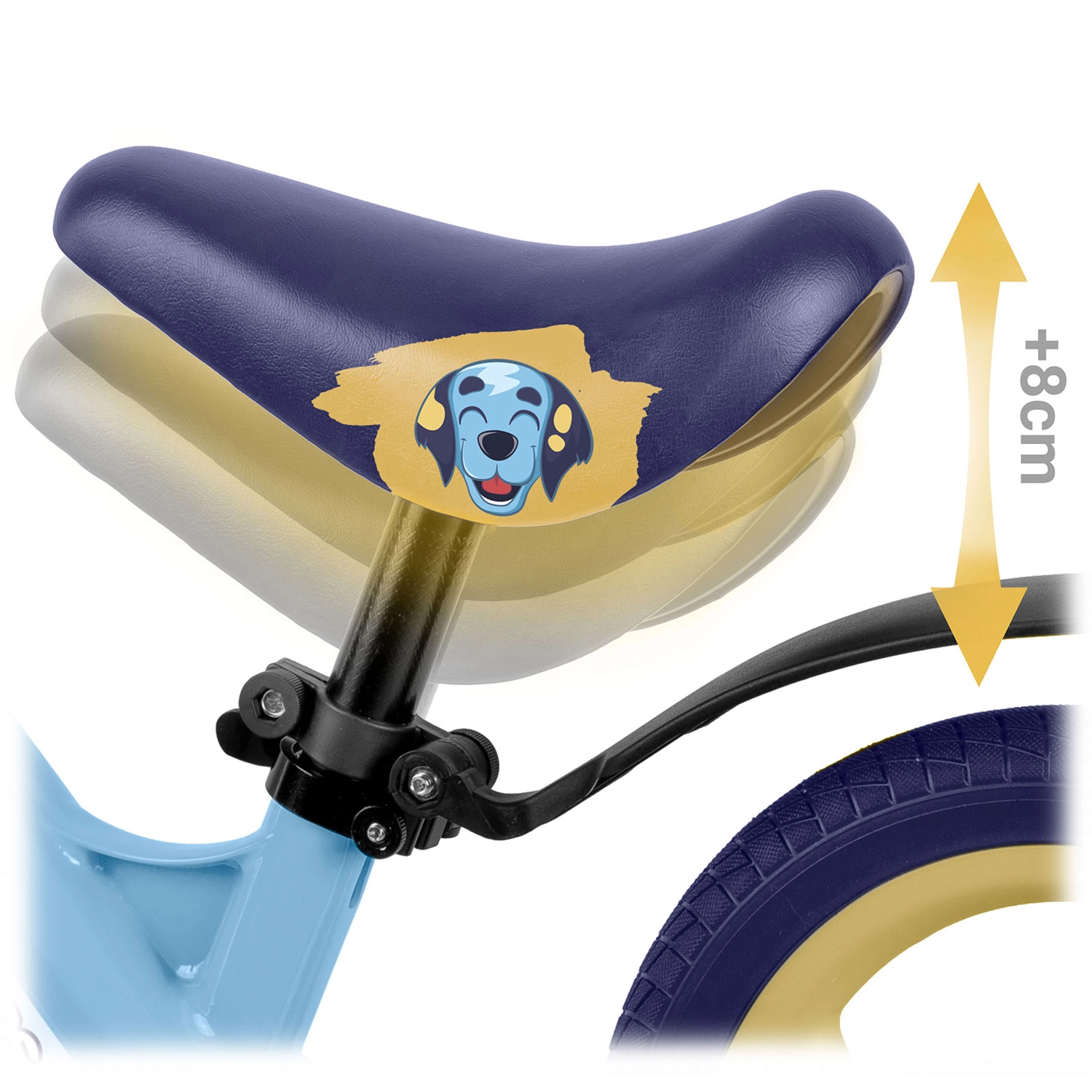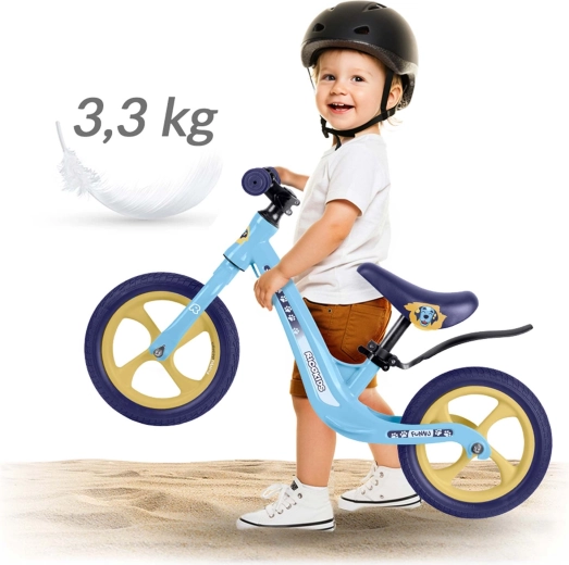 Ergonomsko oblikovan, mehak penast sedež s tekočo nastavitvijo višine (pribl. 35–42 cm) raste z otrokom in omogoča udobno vožnjo v vseh fazah razvoja. Gumirani ročaji z omejevalniki ščitijo roke in izboljšajo zanesljiv oprijem. Poganjalo spodbuja samozavest, koncentracijo in naraven prehod na klasično kolo s pedali.