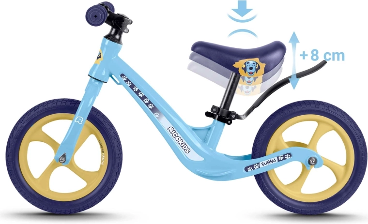 Ricokids Funnu je idealno prvo poganjalo za majhne kolesarje. Zahvaljujoč izjemno lahki konstrukciji ga otroci zlahka obvladujejo sami, starši pa ga brez napora prenesejo v park ali po stopnicah. Magnezijev okvir zagotavlja visoko trdnost ob nizki teži, kolesa iz EVA pene pa so brez vzdrževanja, tiha in neprebojna – popolna za travo, asfalt in prod.