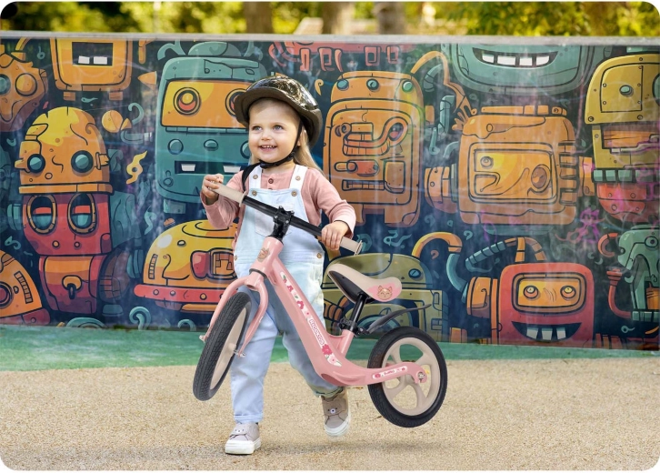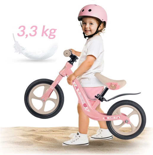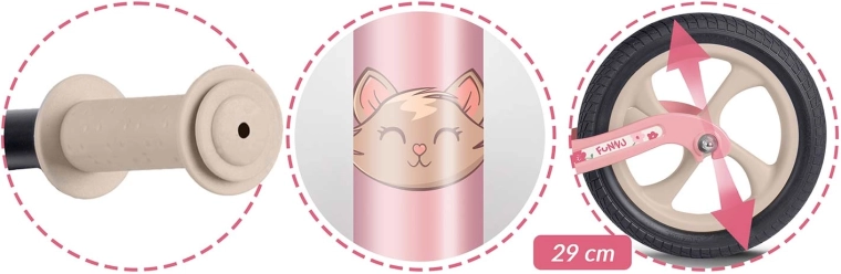 Varnost in udobje sta na prvem mestu: nedrseči ročaji z zaključki omogočajo nadzor nad krmiljenjem, mehki penasti sedež razbremeni hrbet in zadnjico, široko krmilo pa pomaga ohranjati stabilnost. Poganjalec spodbuja naravni razvoj ravnotežja, koordinacije in zbranosti – prehod na klasično kolo s pedali je nato mala malica.