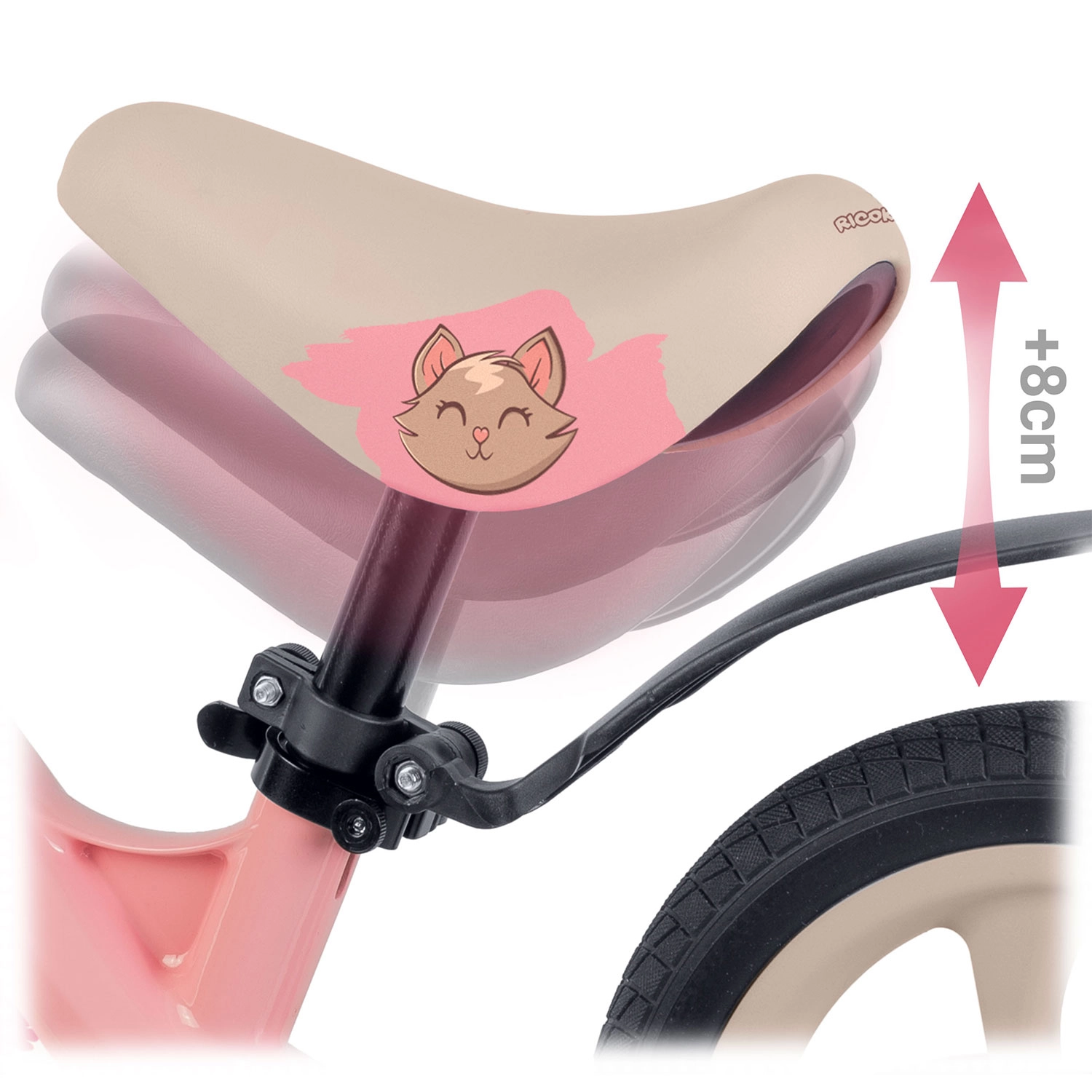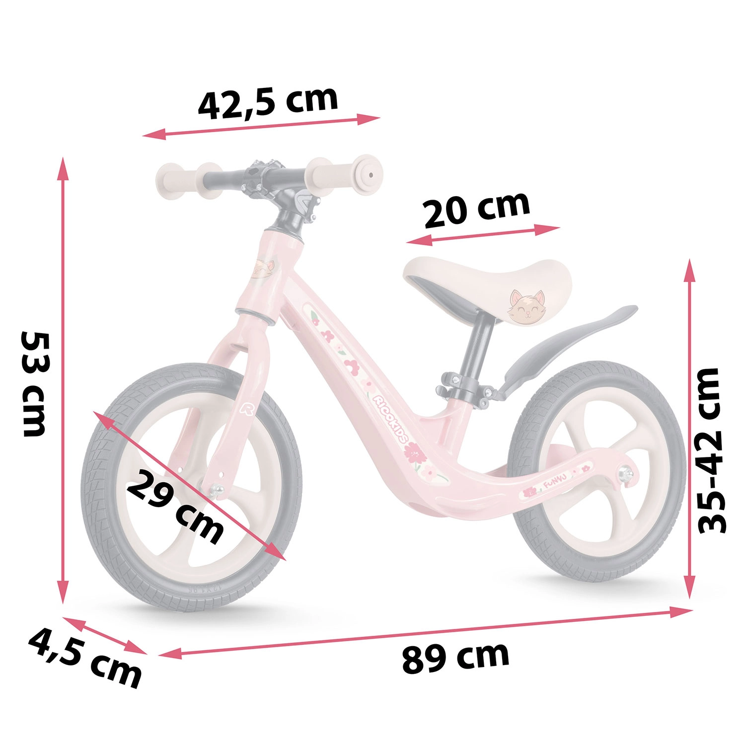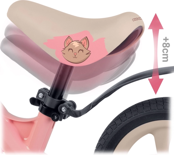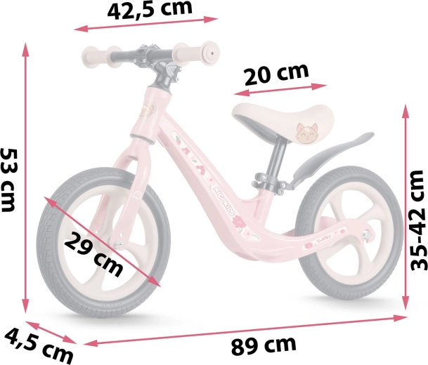Razpon višine 35–42 cm omogoča pravilno nastavitev položaja v vsaki fazi rasti. Ergonomski penasti sedež zagotavlja udobje pri krajših in daljših vožnjah.