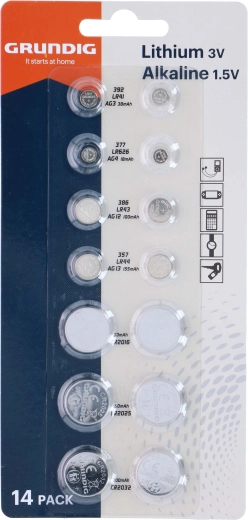 Univerzalni komplet gumbnih baterij GRUNDIG prinaša 14 kosov najpogosteje uporabljenih tipov AG in CR za ure, kalkulatorje, daljinske upravljalnike, LED svetilke in drugo drobno elektroniko. Zanesljiva zmogljivost, dolg življenjski rok in široka združljivost v enem praktičnem pakiranju.