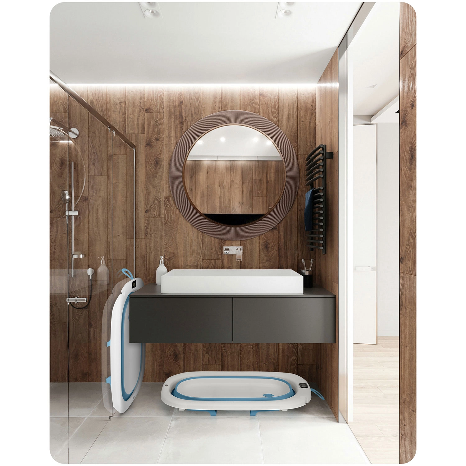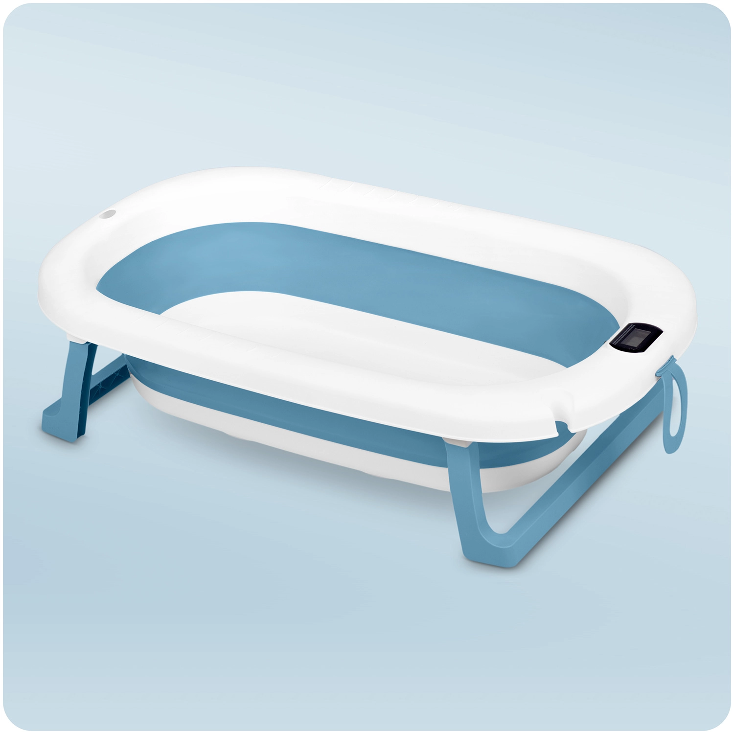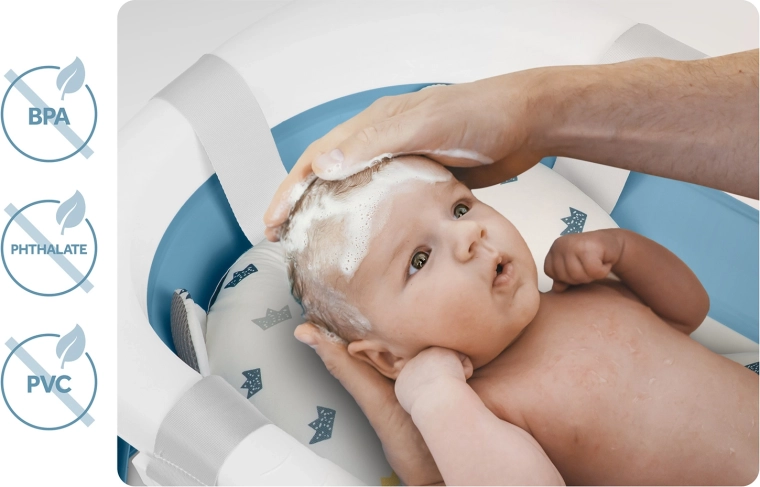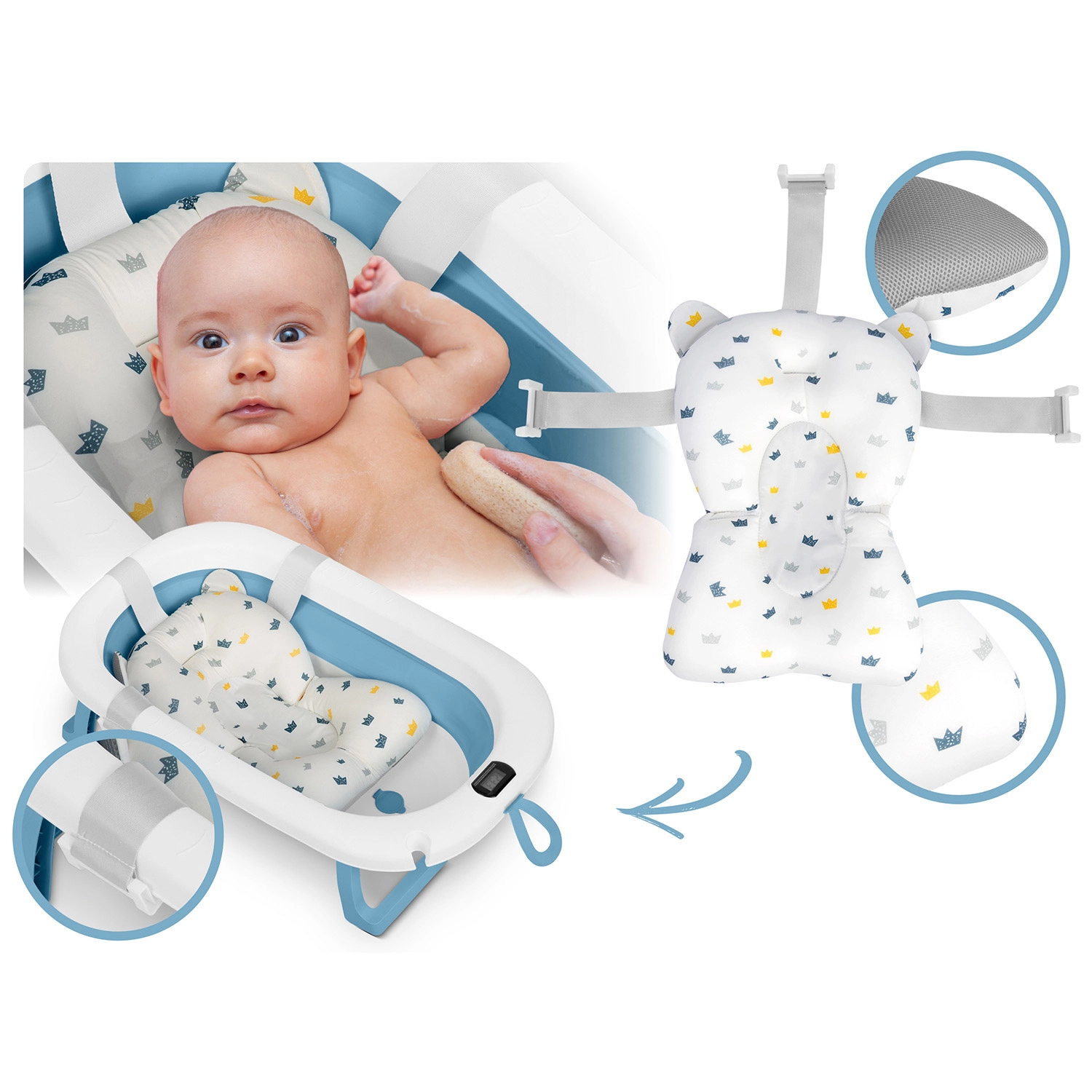Ta zložljiva otroška kadica je zasnovana za varno in udobno kopanje od prvih dni. Elektronski termometer z natančno sondo in LCD-zaslonom pomaga nadzorovati idealno temperaturo vode, medtem ko čep spremeni barvo, ko temperatura preseže 38 °C. Priložena je mehka, zračna in hitro sušeča se vložka z nastavljivimi trakovi, ki nežno podpira dojenčkovo glavico in hrbet.
