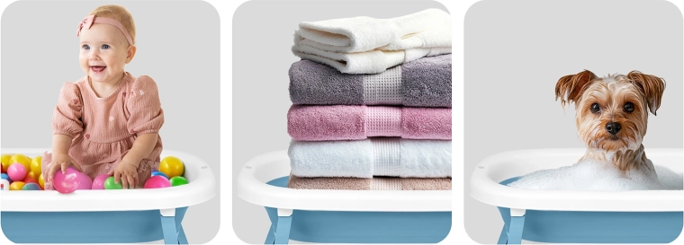 Zahvaljujoč stabilnim zložljivim nogam in nedrsečim zaključkom je kadica stabilna tudi na spolzki površini. Preklopna konstrukcija prihrani prostor, enostavno se prenaša in shranjuje – idealno za manjše kopalnice in počitnice. Praktično držalo za pršno ročico omogoča udobno napolnitev brez nepotrebnega škropljenja.