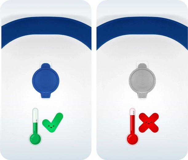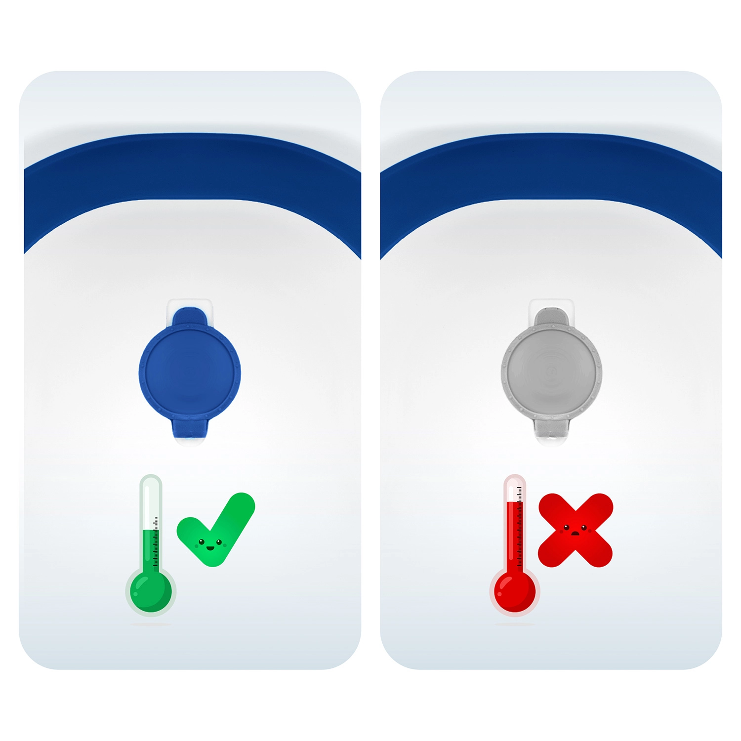 Zložljive noge s protidrsnimi zaključki držijo banjico trdno na mestu. Čep spremeni barvo, ko temperatura preseže 38 °C, zato imate toploto vode vedno pod nadzorom.