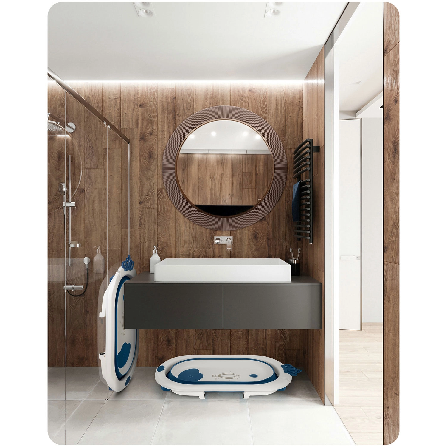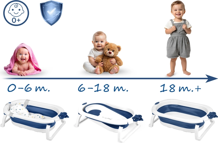 Ta zložljiva banjica raste z vašim otrokom: od varne podpore za novorojenčke na mehki vložki, prek samostojnega sedenja malčkov, do prostornega kopanja predšolskih otrok. Lahka konstrukcija, hitro zlaganje in protidrsne nogice zagotavljajo udobje in zanesljivost pri vsakodnevnem kopanju. Toplotni čep z opozorilom spremeni barvo takoj, ko voda preseže 38 °C.