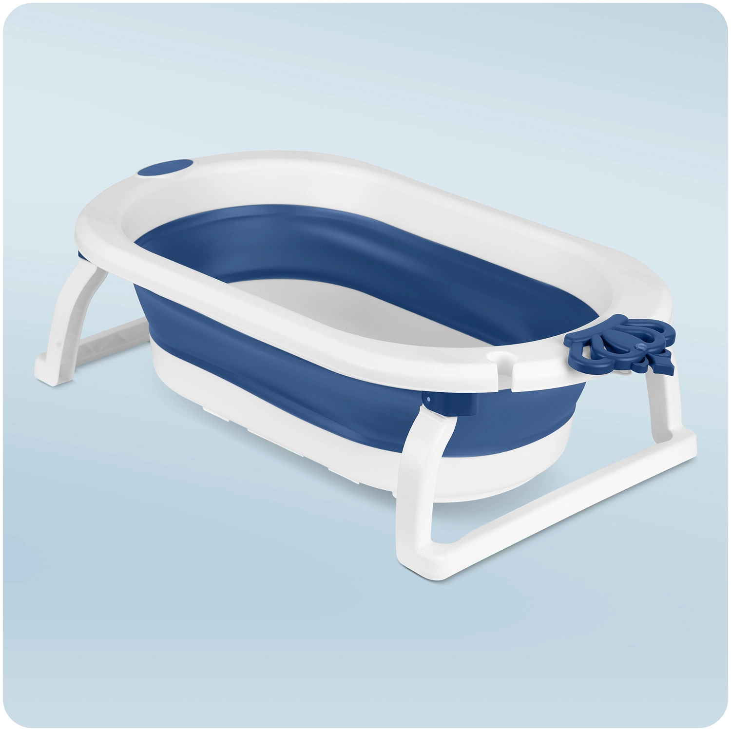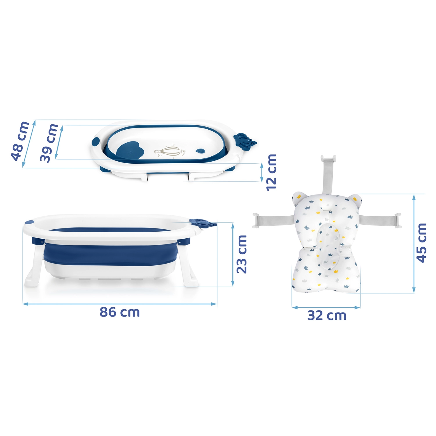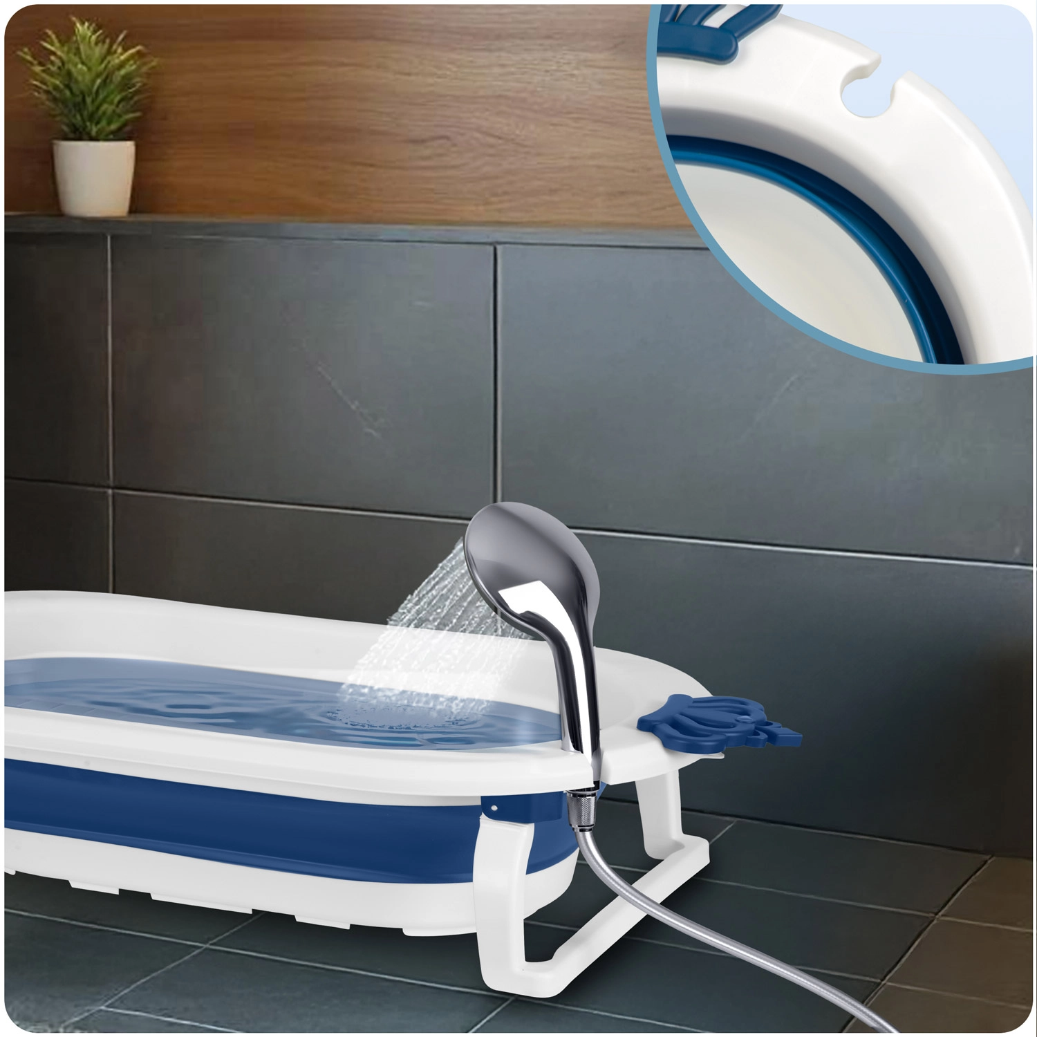 Praktična in varna zložljiva banjica za dojenčke in večje otroke ponuja lahkost in kompaktne mere, stabilne zložljive noge s protidrsnim zaključkom ter toplotni čep, ki spremeni barvo nad 38 °C. Del kompleta je tudi mehka, hitro sušeča se vložka za novorojenčke z nastavljivimi trakovi za zanesljivo pritrditev. Idealna za kopalnico in potovanja – udobno kopanje brez škropljenja zahvaljujoč držalu za pršno glavo.