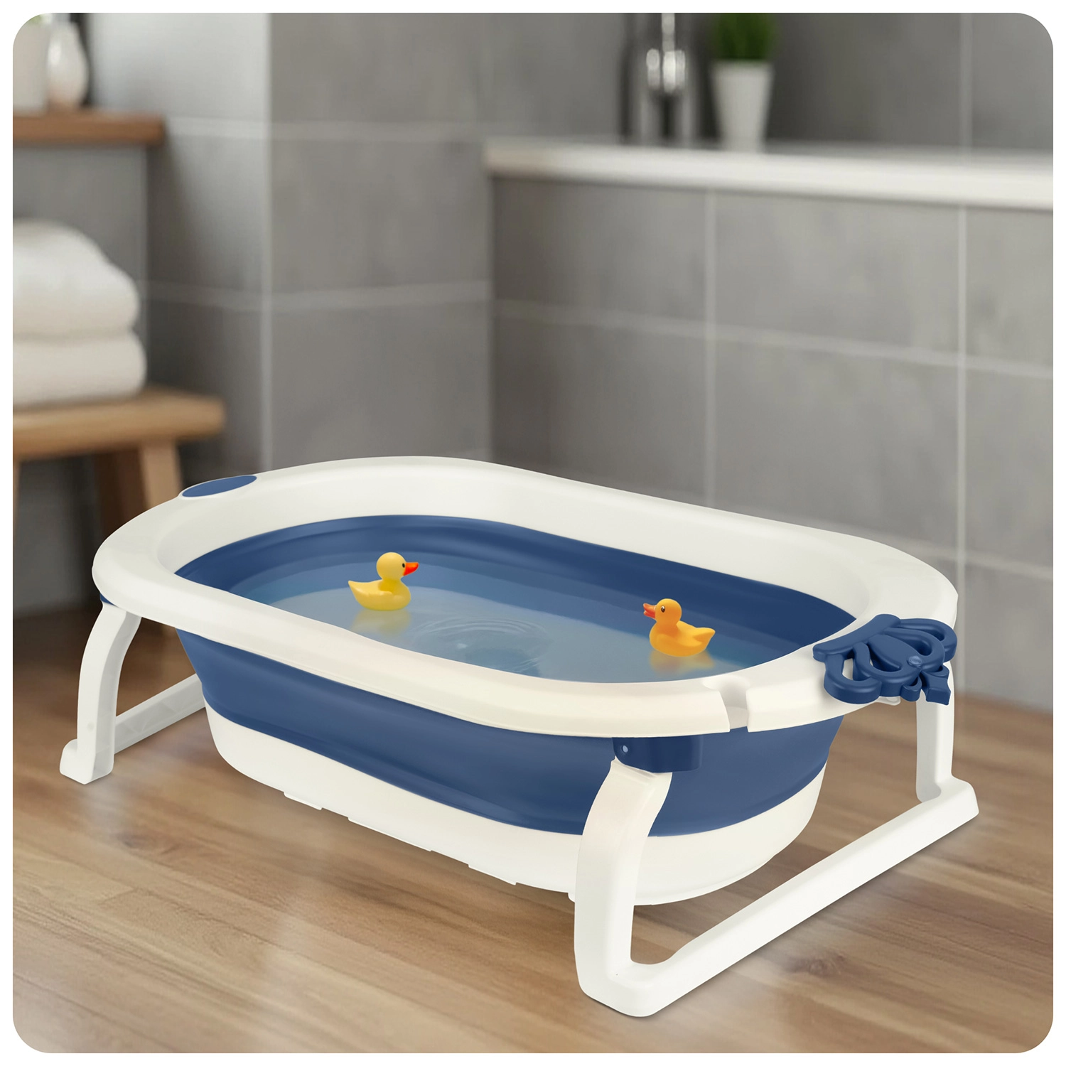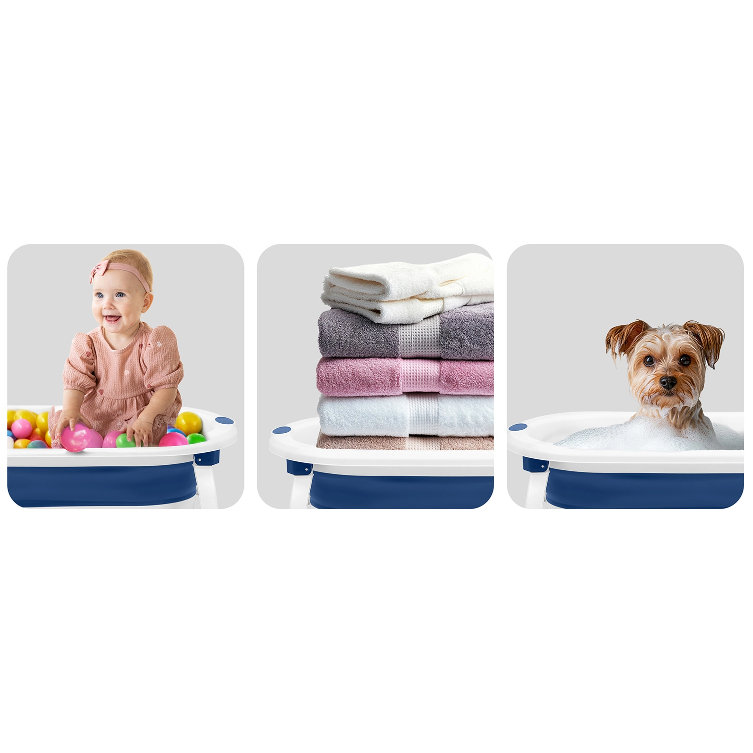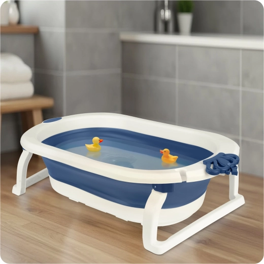 Praktična in varna zložljiva banjica za dojenčke in večje otroke ponuja lahkost in kompaktne mere, stabilne zložljive noge s protidrsnim zaključkom ter toplotni čep, ki spremeni barvo nad 38 °C. Del kompleta je tudi mehka, hitro sušeča se vložka za novorojenčke z nastavljivimi trakovi za zanesljivo pritrditev. Idealna za kopalnico in potovanja – udobno kopanje brez škropljenja zahvaljujoč držalu za pršno glavo.