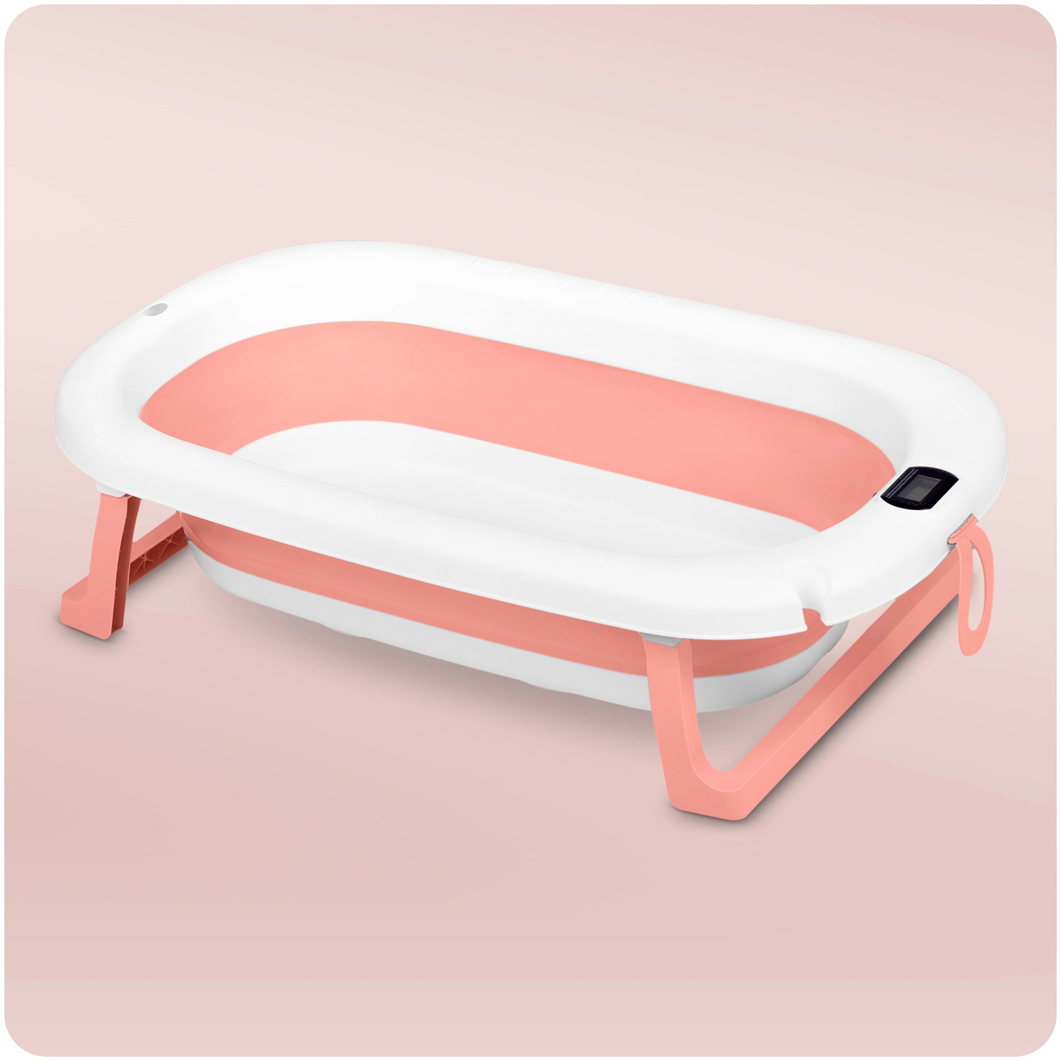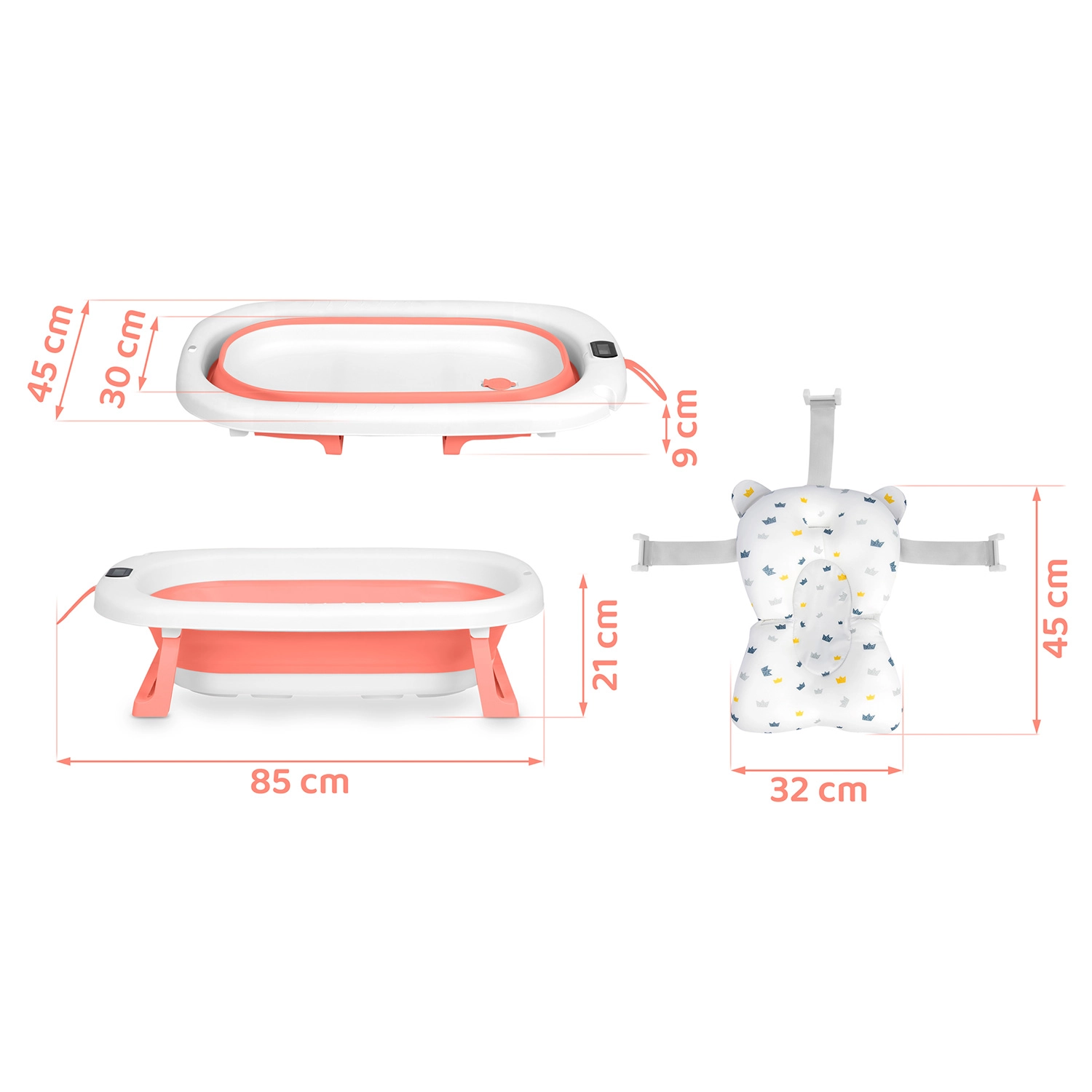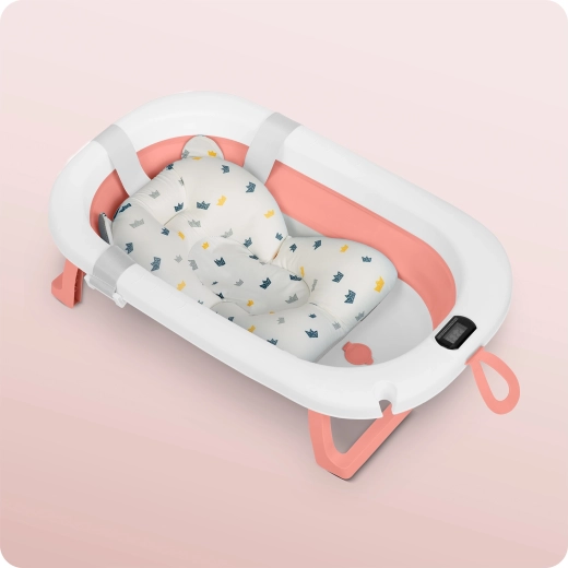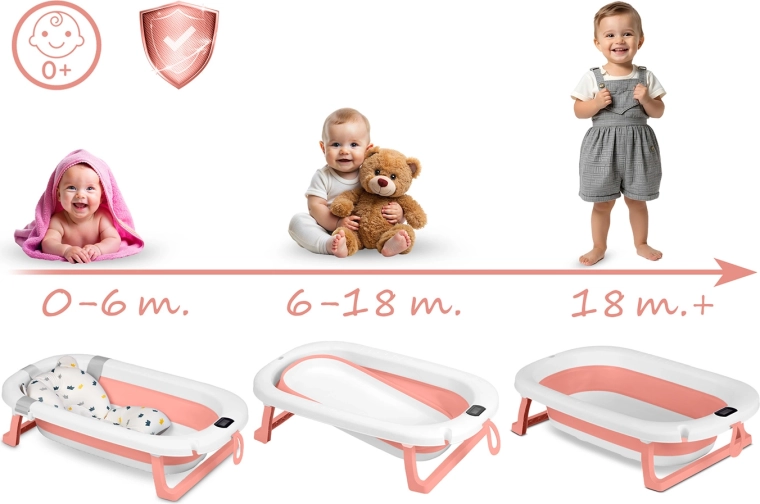 Praktična zložljiva otroška kad z mehkim novorojenčkovim vložkom in natančnim elektronskim termometrom za največje udobje in varnost. Zahvaljujoč stabilnim zložljivim nogam, protizdrsnim nastavkom in barvnemu indikatorju temperature je kopanje enostavno in varno. Kad je lahka, prostorsko varčna in ponuja nosilnost do 45 kg, zato raste skupaj z vašim otrokom.
