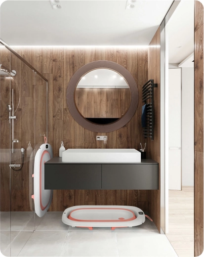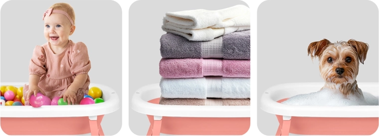 Robustna zložljiva konstrukcija s protizdrsnimi nogicami zagotavlja stabilnost tudi na spolzki podlagi. Vgrajeno držalo za pršno glavo olajša polnjenje brez škropljenja. Po kopanju kad preprosto zložite v kompakten format, obesite na zanko ali shranite v omaro – idealno za manjše kopalnice in za na pot.