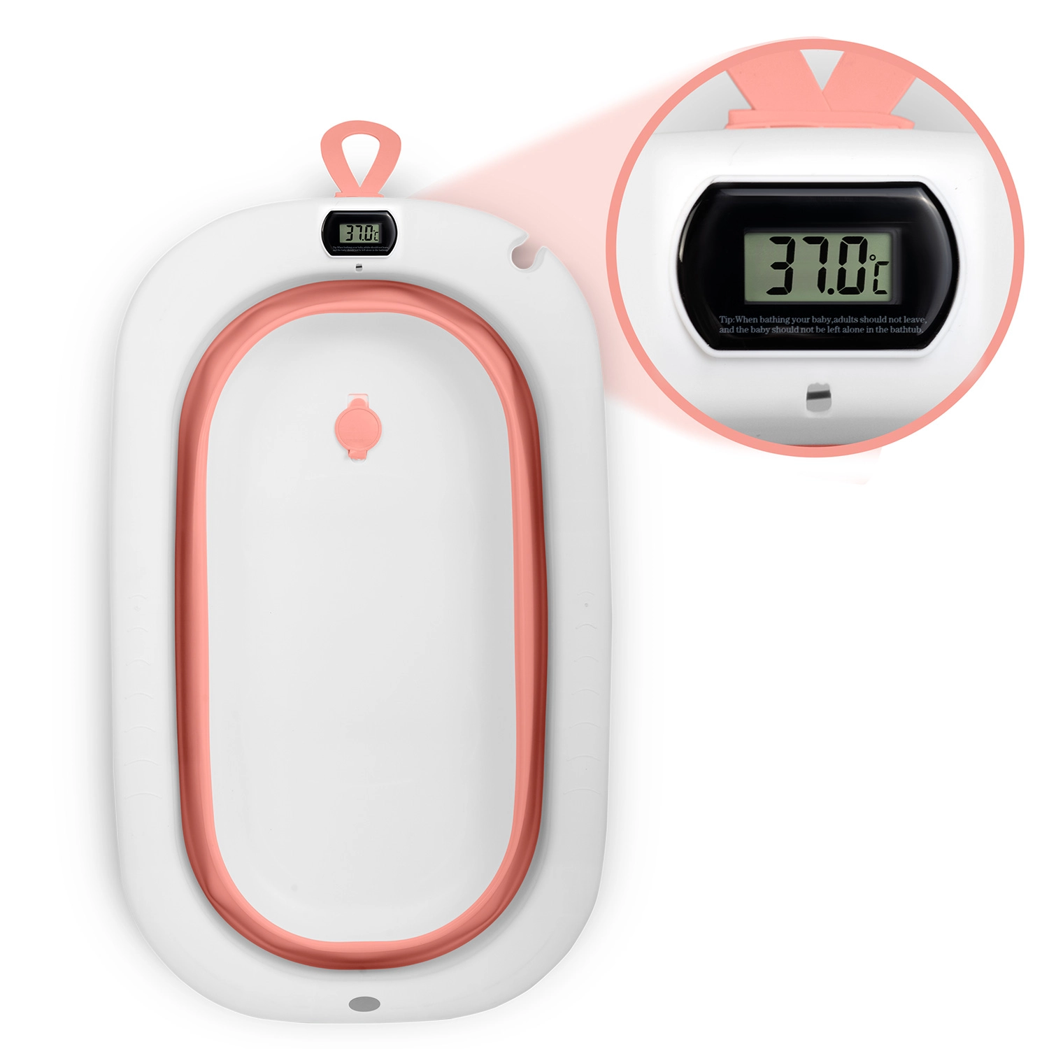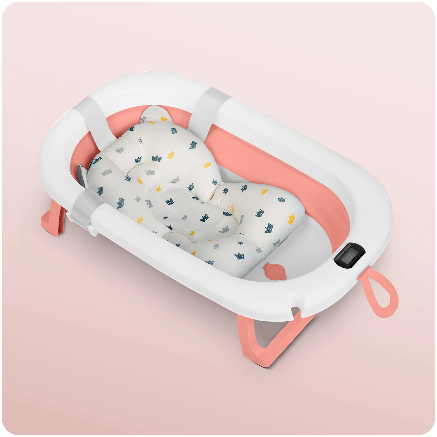 Ta sodobna zložljiva kad zagotavlja varno in udobno kopanje od prvih dni dalje. V kompletu je mehak, hitro sušeč se vložek za novorojenčke z nastavljivimi trakovi za zanesljivo pritrditev. Elektronski termometer z berljivim LCD zaslonom sproti nadzoruje temperaturo vode, medtem ko barvni čep/zamašek spremeni barvo nad 38 °C za dodatno vizualno kontrolo.