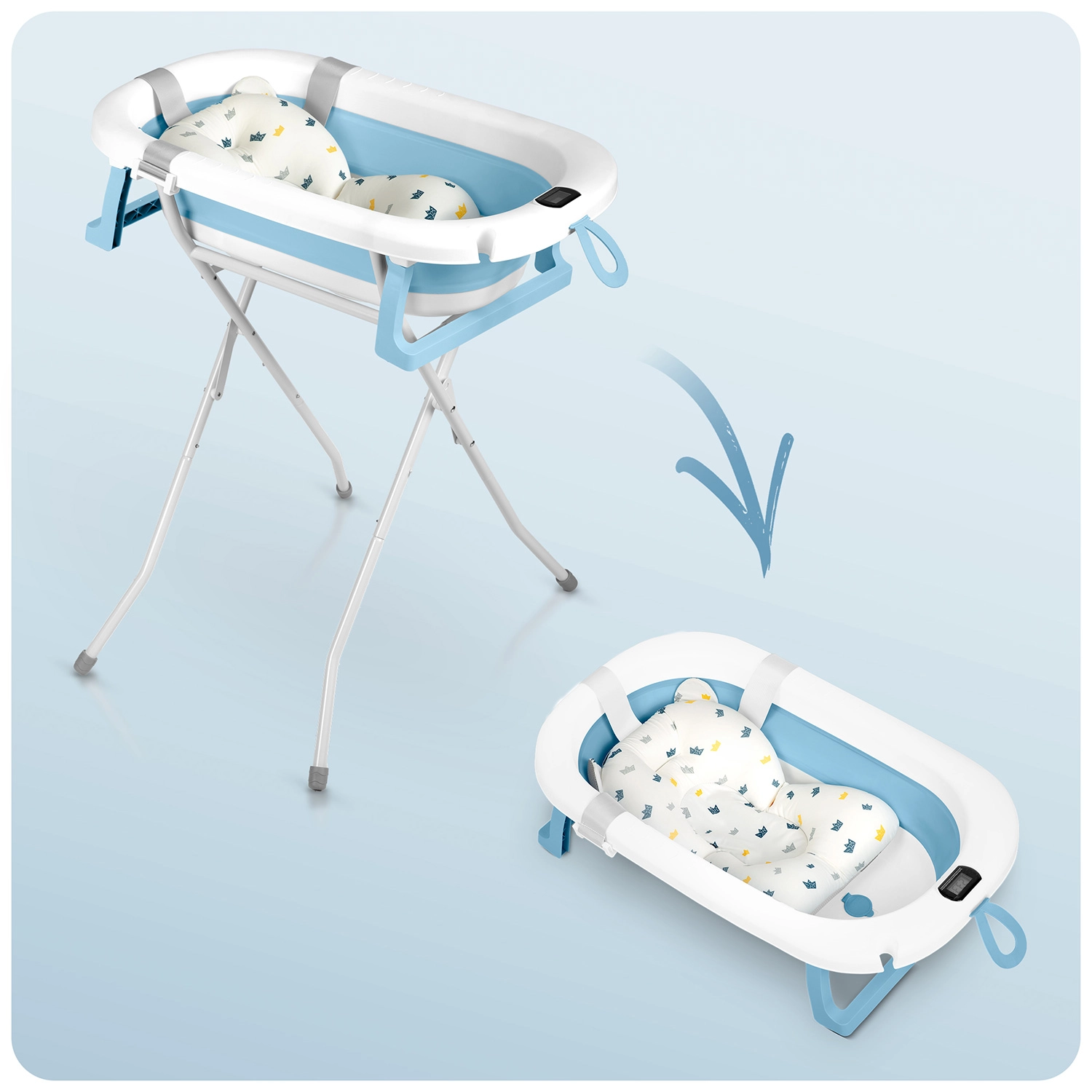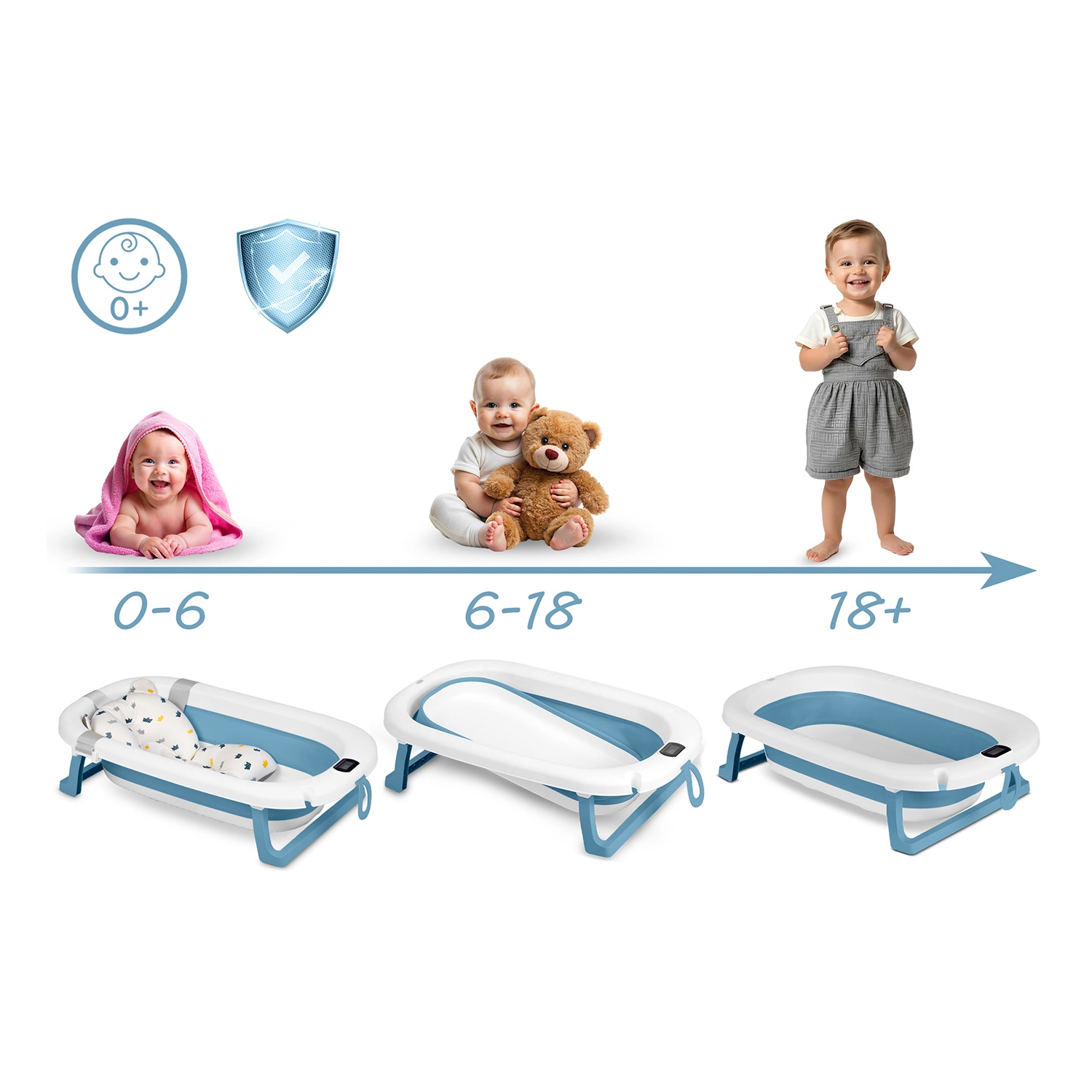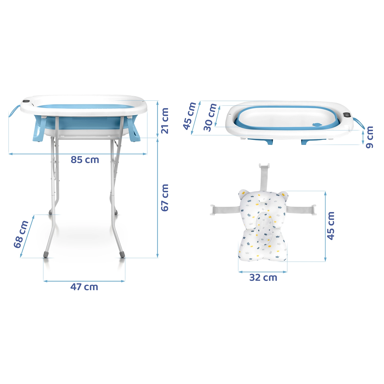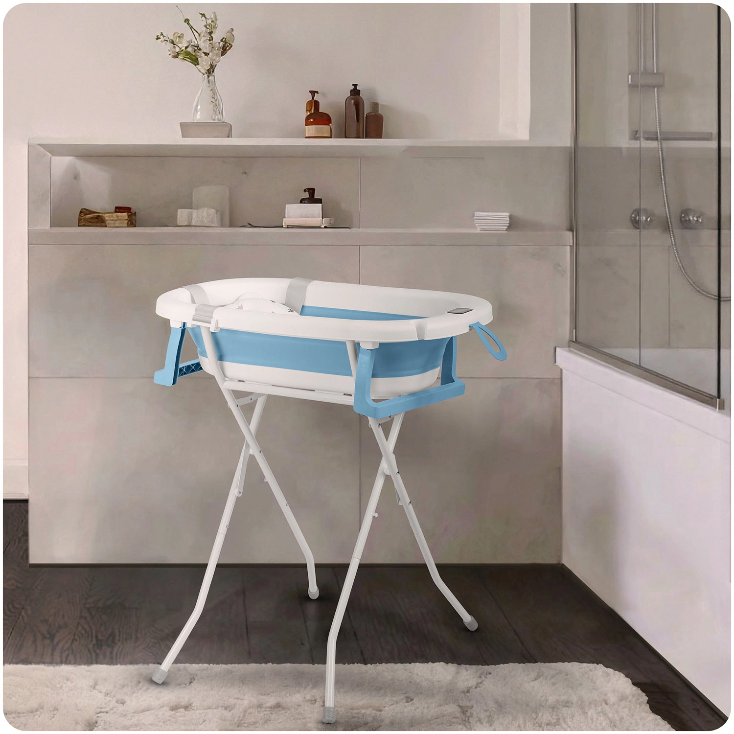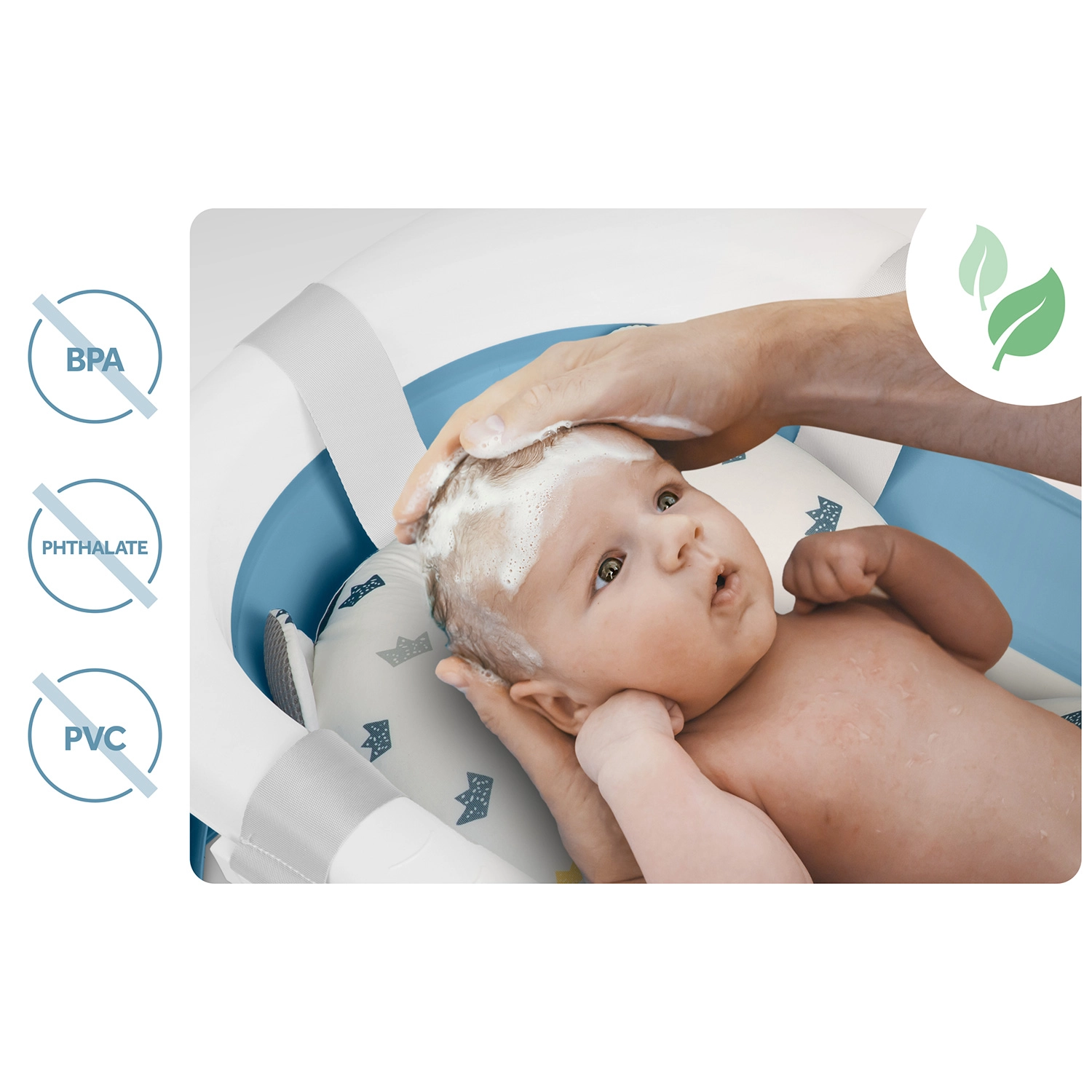 Maksimalno udobje in varnost pri kopanju od prvih dni. Mehka, hitro sušeča se vložka nežno podpira glavico in hrbet dojenčka, medtem ko zložljivo kovinsko stojalo dvigne banjico na ergonomsko višino. Proti zdrsne nogice zagotavljajo stabilnost tudi na gladkih površinah, čep, ki spremeni barvo ob preseženi temperaturi 38 °C, pa opozori na previsoko temperaturo vode.