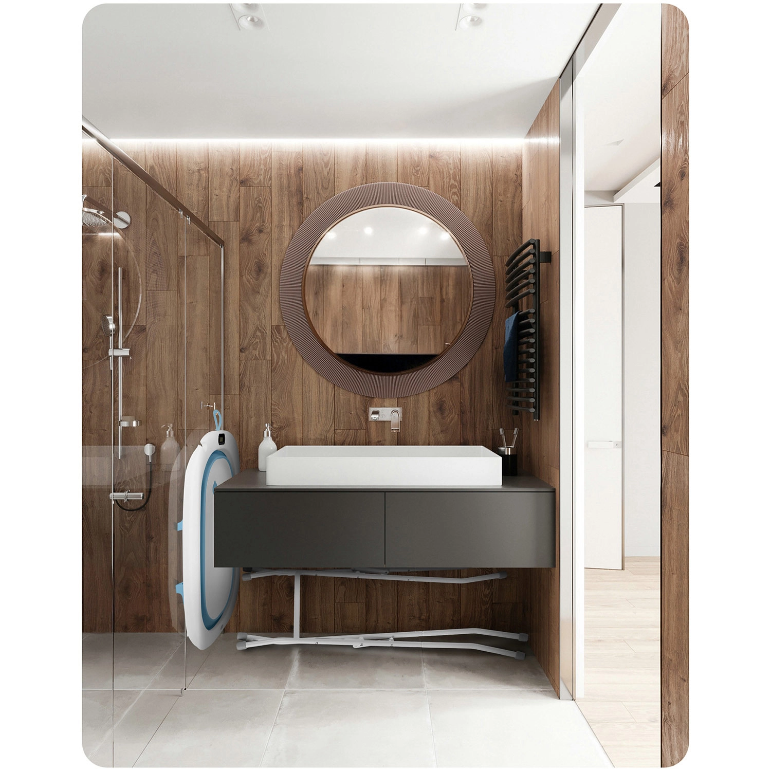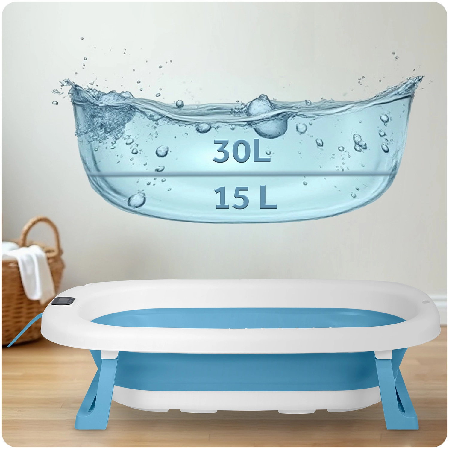 Pametna oprema za enostavno kopanje. Elektronski termometer z berljivim LCD-zaslonom sproti spremlja temperaturo vode. Vgrajeno držalo za prho omogoča polnjenje brez škropljenja in prosti roki med umivanjem. Zahvaljujoč stranskim ročajem in obešalnemu ušesu banjico zlahka prenašate in shranjujete.